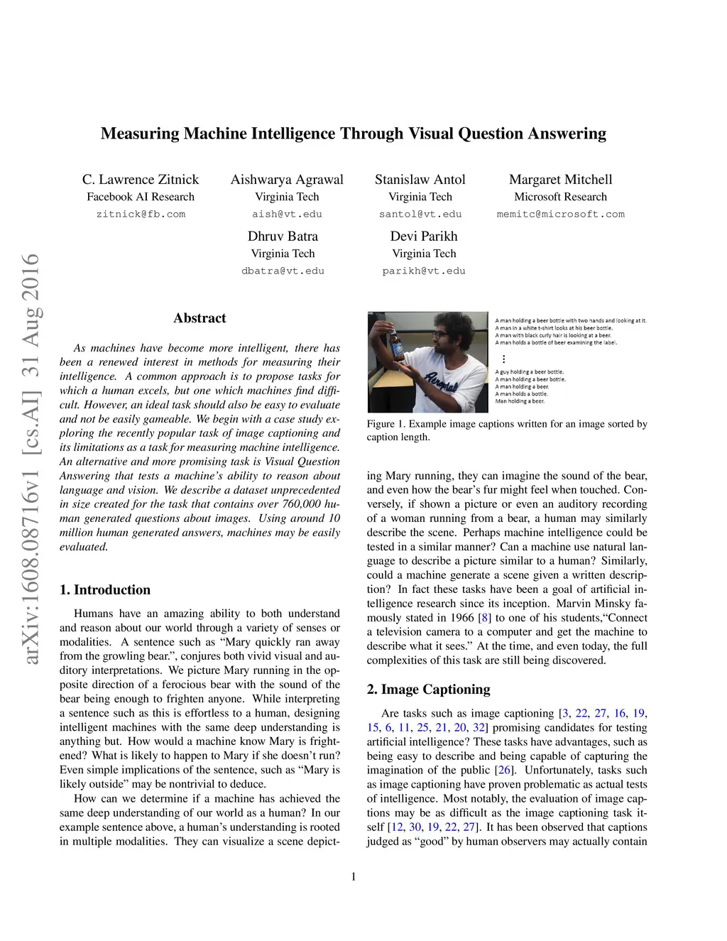 As machines have become more intelligent, there has been a renewed interest in methods for measuring their intelligence. A common approach is to propose tasks for which a human excels, but one which machines find difficult. However, an ideal task should also be easy to evaluate and not be easily gameable. We begin with a case study exploring the recently popular task of image captioning and its limitations as a task for measuring machine intelligence. An alternative and more promising task is Visual Question Answering that tests a machine's ability to reason about language and vision. We describe a dataset unprecedented in size created for the task that contains over 760,000 human generated questions about images. Using around 10 million human generated answers, machines may be easily evaluated.