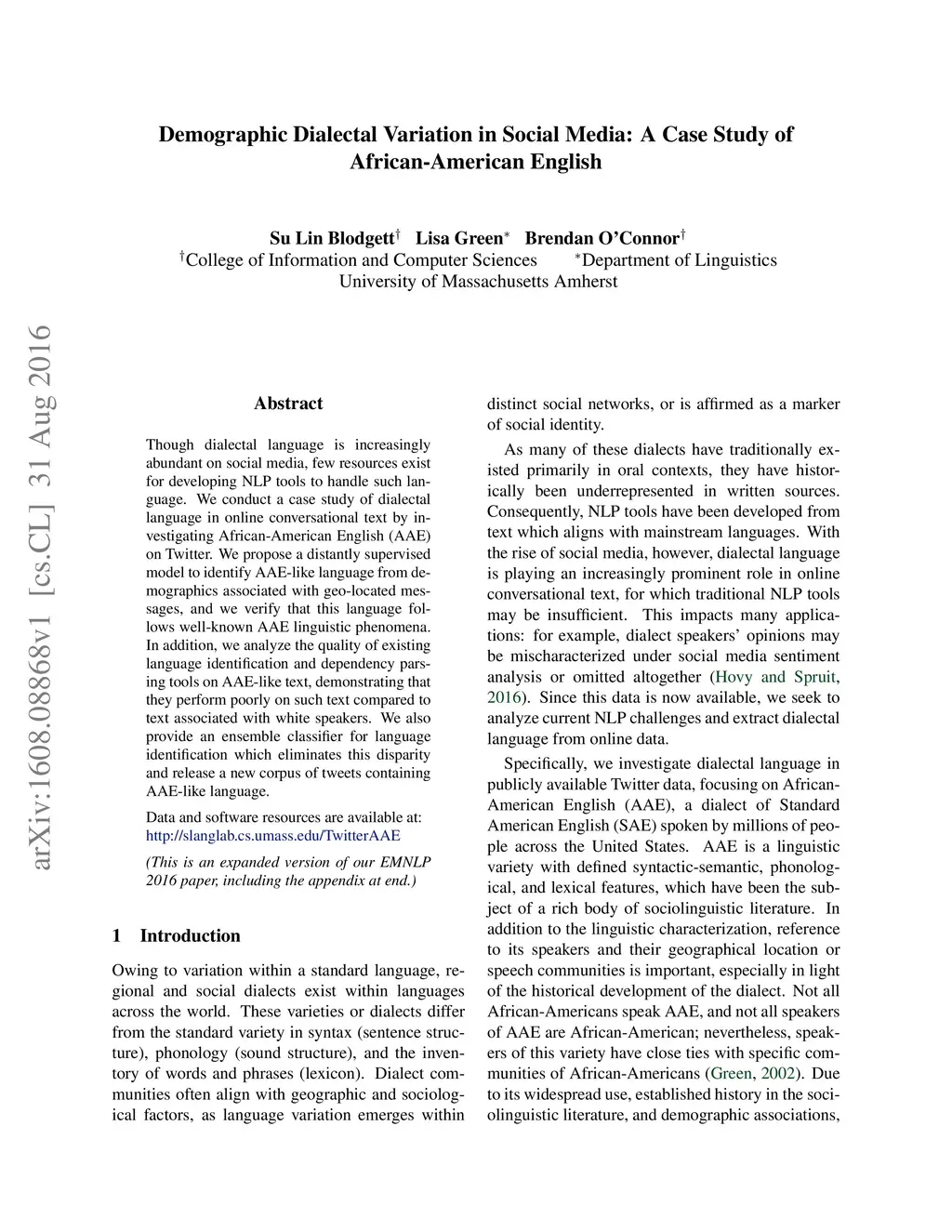 Though dialectal language is increasingly abundant on social media, few resources exist for developing NLP tools to handle such language. We conduct a case study of dialectal language in online conversational text by investigating African-American English (AAE) on Twitter. We propose a distantly supervised model to identify AAE-like language from demographics associated with geo-located messages, and we verify that this language follows well-known AAE linguistic phenomena. In addition, we analyze the quality of existing language identification and dependency parsing tools on AAE-like text, demonstrating that they perform poorly on such text compared to text associated with white speakers. We also provide an ensemble classifier for language identification which eliminates this disparity and release a new corpus of tweets containing AAE-like language.