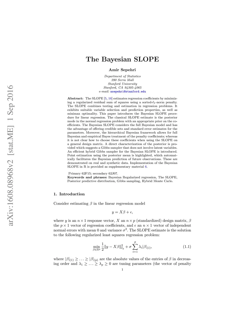 The SLOPE estimates regression coefficients by minimizing a regularized residual sum of squares using a sorted--norm penalty. The SLOPE combines testing and estimation in regression problems. It exhibits suitable variable selection and prediction properties, as well as minimax optimality. This paper introduces the Bayesian SLOPE procedure for linear regression. The classical SLOPE estimate is the posterior mode in the normal regression problem with an appropriate prior on the coefficients. The Bayesian SLOPE considers the full Bayesian model and has the advantage of offering credible sets and standard error estimates for the parameters. Moreover, the hierarchical Bayesian framework allows for full Bayesian and empirical Bayes treatment of the penalty coefficients; whereas it is not clear how to choose these coefficients when using the SLOPE on a general design matrix. A direct characterization of the posterior is provided which suggests a Gibbs sampler that does not involve latent variables. An efficient hybrid Gibbs sampler for the Bayesian SLOPE is introduced. Point estimation using the posterior mean is highlighted, which automatically facilitates the Bayesian prediction of future observations. These are demonstrated on real and synthetic data.