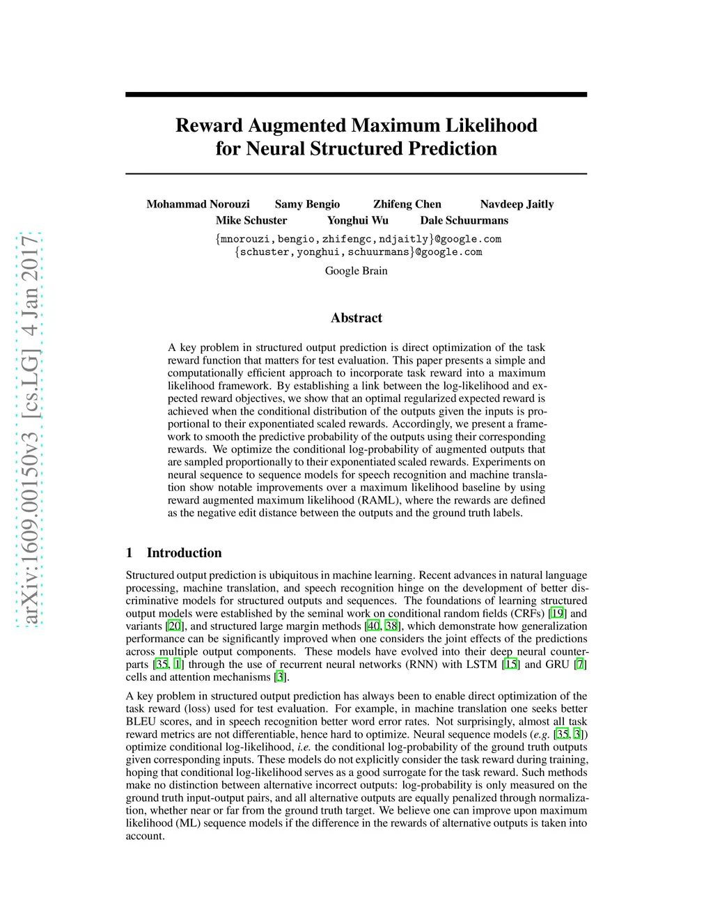 Reward Augmented Maximum Likelihood for Neural Structured Prediction