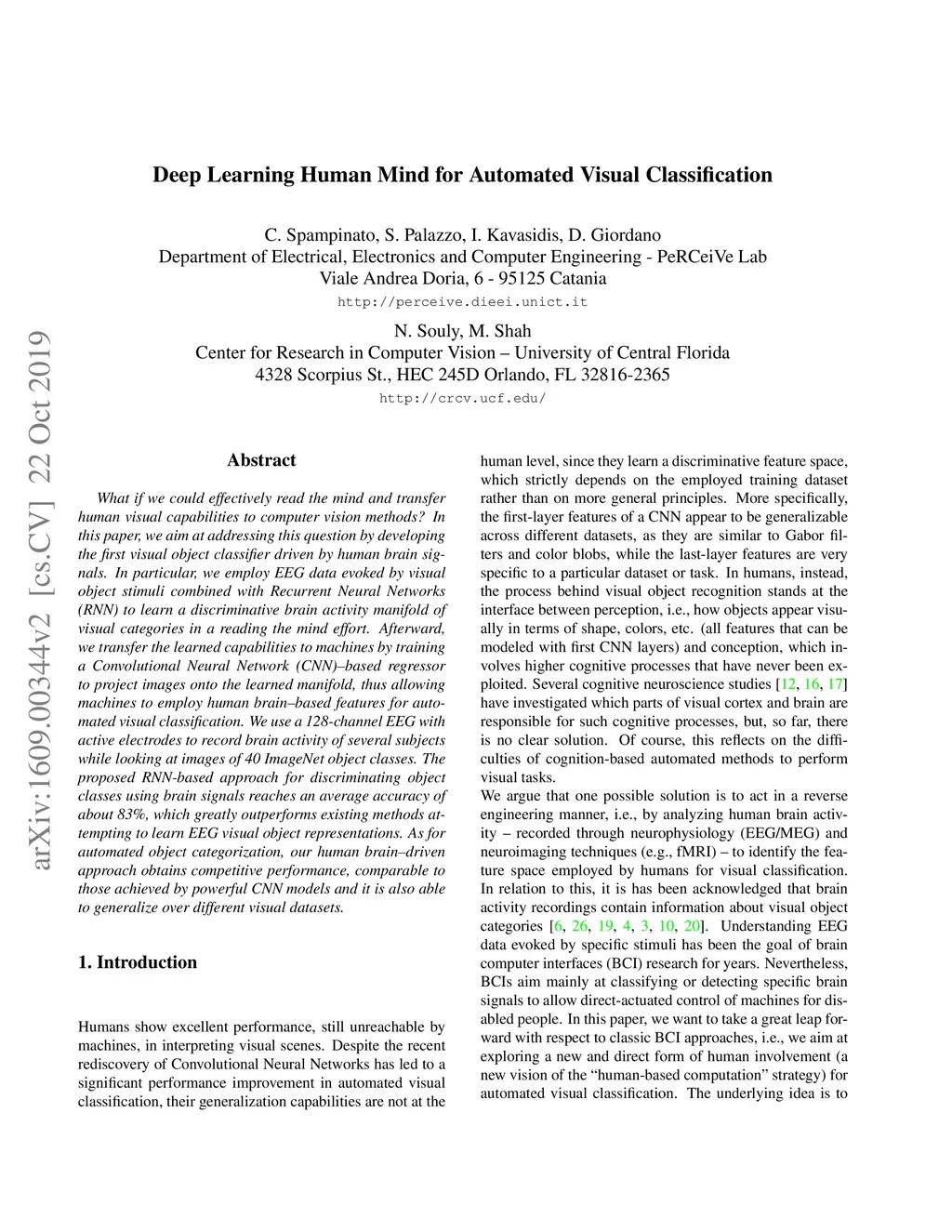 What if we could effectively read the mind and transfer human visual capabilities to computer vision methods? In this paper, we aim at addressing this question by developing the first visual object classifier driven by human brain signals. In particular, we employ EEG data evoked by visual object stimuli combined with Recurrent Neural Networks (RNN) to learn a discriminative brain activity manifold of visual categories. Afterwards, we train a Convolutional Neural Network (CNN)-based regressor to project images onto the learned manifold, thus effectively allowing machines to employ human brain-based features for automated visual classification. We use a 32-channel EEG to record brain activity of seven subjects while looking at images of 40 ImageNet object classes. The proposed RNN based approach for discriminating object classes using brain signals reaches an average accuracy of about 40%, which outperforms existing methods attempting to learn EEG visual object representations. As for automated object categorization, our human brain-driven approach obtains competitive performance, comparable to those achieved by powerful CNN models, both on ImageNet and CalTech 101, thus demonstrating its classification and generalization capabilities. This gives us a real hope that, indeed, human mind can be read and transferred to machines.