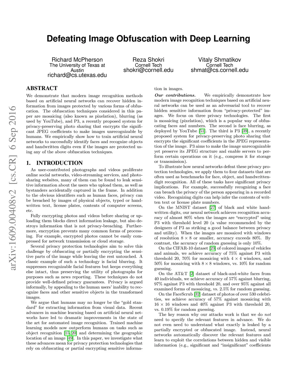 We demonstrate that modern image recognition methods based on artificial neural networks can recover hidden information from images protected by various forms of obfuscation. The obfuscation techniques considered in this paper are mosaicing (also known as pixelation), blurring (as used by YouTube), and P3, a recently proposed system for privacy-preserving photo sharing that encrypts the significant JPEG coefficients to make images unrecognizable by humans. We empirically show how to train artificial neural networks to successfully identify faces and recognize objects and handwritten digits even if the images are protected using any of the above obfuscation techniques.