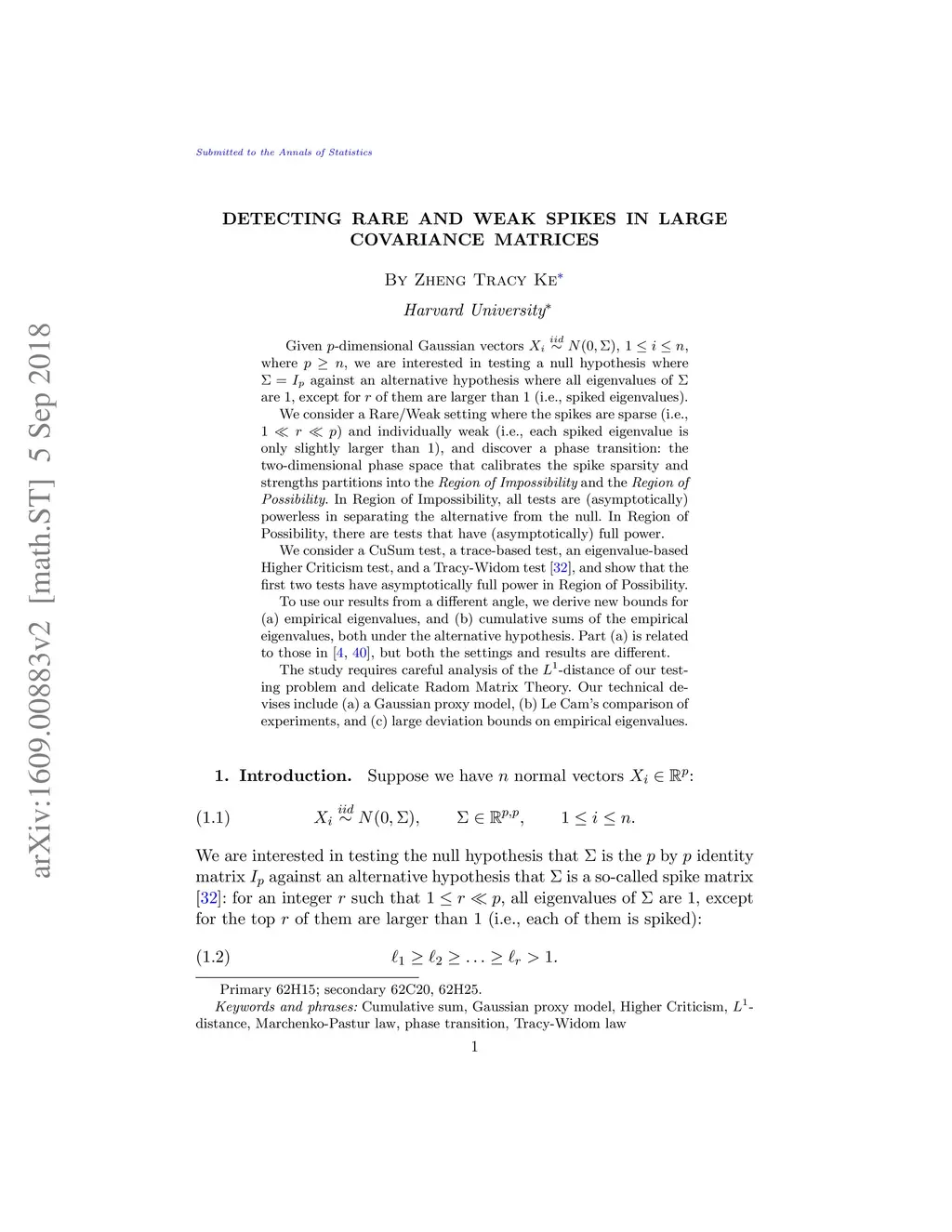 Given -dimensional Gaussian vectors , , where , we are interested in testing a null hypothesis where against an alternative hypothesis where all eigenvalues of are , except for of them are larger than (i.e., spiked eigenvalues). We consider a Rare/Weak setting where the spikes are sparse (i.e., ) and individually weak (i.e., each spiked eigenvalue is only slightly larger than ), and discover a phase transition: the two-dimensional phase space that calibrates the spike sparsity and strengths partitions into the Region of Impossibility and the Region of Possibility. In Region of Impossibility, all tests are (asymptotically) powerless in separating the alternative from the null. In Region of Possibility, there are tests that have (asymptotically) full power. We consider a CuSum test, a trace-based test, an eigenvalue-based Higher Criticism test, and a Tracy-Widom test (Johnstone 2001), and show that the first two tests have asymptotically full power in Region of Possibility. To use our results from a different angle, we derive new bounds for (a) empirical eigenvalues, and (b) cumulative sums of the empirical eigenvalues, both under the alternative hypothesis. Part (a) is related to those in Baik, Ben-Arous and Peche (2005), but both the settings and results are different. The study requires careful analysis of the -distance of our testing problem and delicate Radom Matrix Theory. Our technical devises include (a) a Gaussian proxy model, (b) Le Cam's comparison of experiments, and (c) large deviation bounds on empirical eigenvalues.