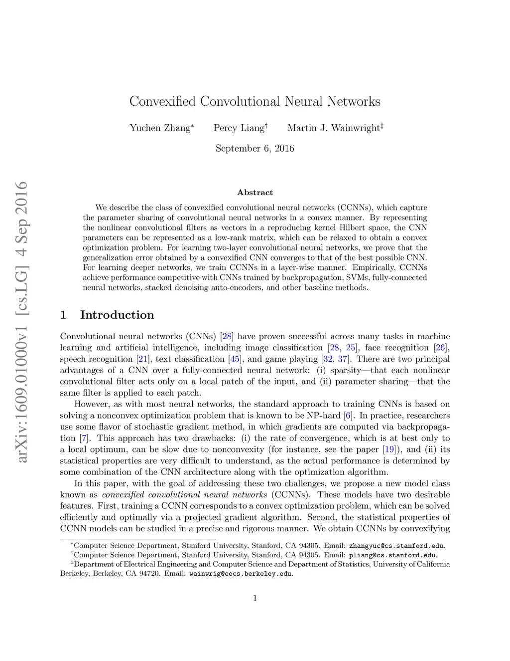 We describe the class of convexified convolutional neural networks (CCNNs), which capture the parameter sharing of convolutional neural networks in a convex manner. By representing the nonlinear convolutional filters as vectors in a reproducing kernel Hilbert space, the CNN parameters can be represented as a low-rank matrix, which can be relaxed to obtain a convex optimization problem. For learning two-layer convolutional neural networks, we prove that the generalization error obtained by a convexified CNN converges to that of the best possible CNN. For learning deeper networks, we train CCNNs in a layer-wise manner. Empirically, CCNNs achieve performance competitive with CNNs trained by backpropagation, SVMs, fully-connected neural networks, stacked denoising auto-encoders, and other baseline methods.