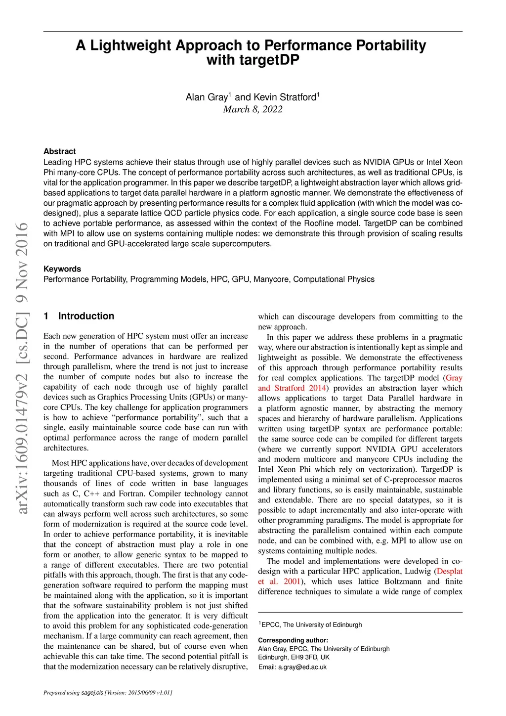 Leading HPC systems achieve their status through use of highly parallel devices such as NVIDIA GPUs or Intel Xeon Phi many-core CPUs. The concept of performance portability across such architectures, as well as traditional CPUs, is vital for the application programmer. In this paper we describe targetDP, a lightweight abstraction layer which allows grid-based applications to target data parallel hardware in a platform agnostic manner. We demonstrate the effectiveness of our pragmatic approach by presenting performance results for a complex fluid application (with which the model was co-designed), plus a separate lattice QCD particle physics code. For each application, a single source code base is seen to achieve portable performance, as assessed within the context of the Roofline model. TargetDP can be combined with MPI to allow use on systems containing multiple nodes: we demonstrate this through provision of scaling results on traditional and GPU-accelerated large scale supercomputers.