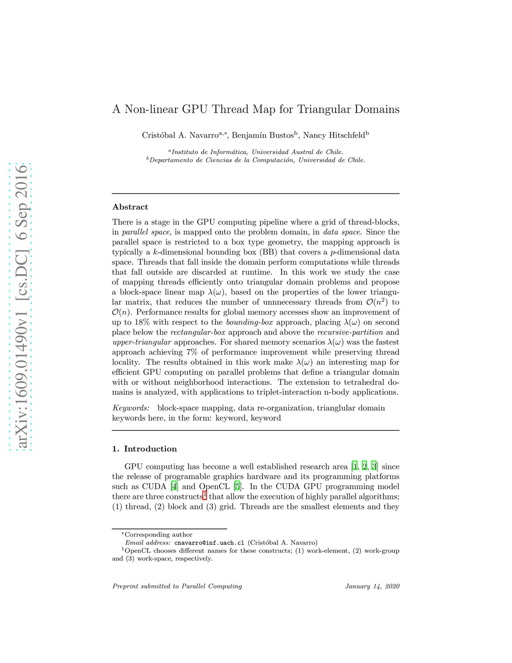 There is a stage in the GPU computing pipeline where a grid of thread-blocks, in \textit{parallel space}, is mapped onto the problem domain, in \textit{data space}. Since the parallel space is restricted to a box type geometry, the mapping approach is typically a -dimensional bounding box (BB) that covers a -dimensional data space. Threads that fall inside the domain perform computations while threads that fall outside are discarded at runtime. In this work we study the case of mapping threads efficiently onto triangular domain problems and propose a block-space linear map , based on the properties of the lower triangular matrix, that reduces the number of unnnecessary threads from to . Performance results for global memory accesses show an improvement of up to with respect to the \textit{bounding-box} approach, placing on second place below the \textit{rectangular-box} approach and above the \textit{recursive-partition} and \textit{upper-triangular} approaches. For shared memory scenarios was the fastest approach achieving of performance improvement while preserving thread locality. The results obtained in this work make an interesting map for efficient GPU computing on parallel problems that define a triangular domain with or without neighborhood interactions. The extension to tetrahedral domains is analyzed, with applications to triplet-interaction n-body applications.