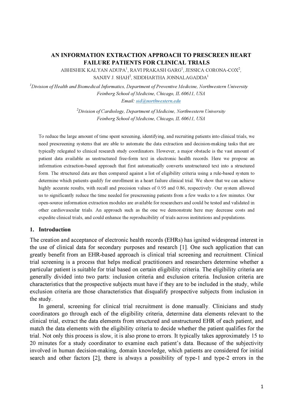 To reduce the large amount of time spent screening, identifying, and recruiting patients into clinical trials, we need prescreening systems that are able to automate the data extraction and decision-making tasks that are typically relegated to clinical research study coordinators. However, a major obstacle is the vast amount of patient data available as unstructured free-form text in electronic health records. Here we propose an information extraction-based approach that first automatically converts unstructured text into a structured form. The structured data are then compared against a list of eligibility criteria using a rule-based system to determine which patients qualify for enrollment in a heart failure clinical trial. We show that we can achieve highly accurate results, with recall and precision values of 0.95 and 0.86, respectively. Our system allowed us to significantly reduce the time needed for prescreening patients from a few weeks to a few minutes. Our open-source information extraction modules are available for researchers and could be tested and validated in other cardiovascular trials. An approach such as the one we demonstrate here may decrease costs and expedite clinical trials, and could enhance the reproducibility of trials across institutions and populations.