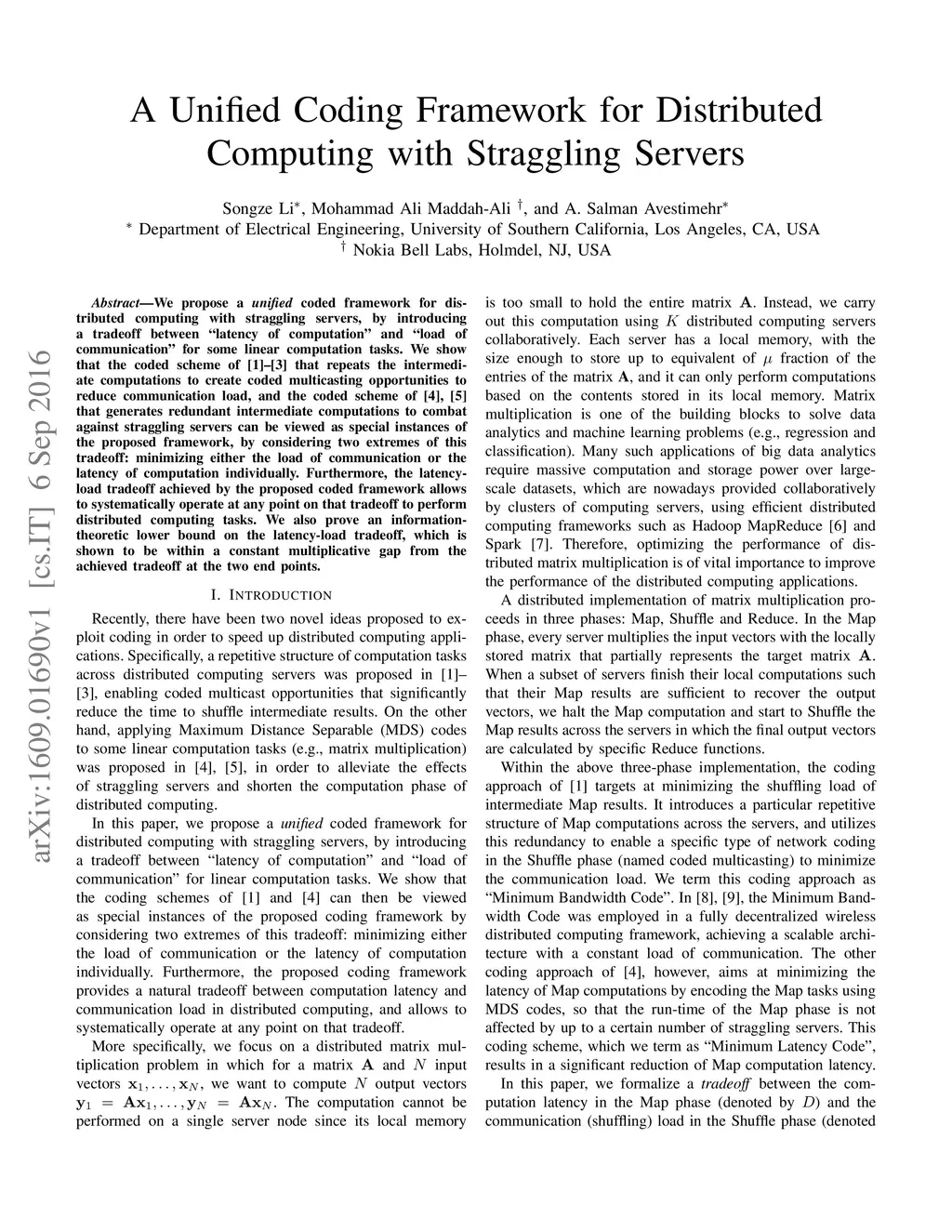 We propose a unified coded framework for distributed computing with straggling servers, by introducing a tradeoff between "latency of computation" and "load of communication" for some linear computation tasks. We show that the coded scheme of [1]-[3] that repeats the intermediate computations to create coded multicasting opportunities to reduce communication load, and the coded scheme of [4], [5] that generates redundant intermediate computations to combat against straggling servers can be viewed as special instances of the proposed framework, by considering two extremes of this tradeoff: minimizing either the load of communication or the latency of computation individually. Furthermore, the latency-load tradeoff achieved by the proposed coded framework allows to systematically operate at any point on that tradeoff to perform distributed computing tasks. We also prove an information-theoretic lower bound on the latency-load tradeoff, which is shown to be within a constant multiplicative gap from the achieved tradeoff at the two end points.