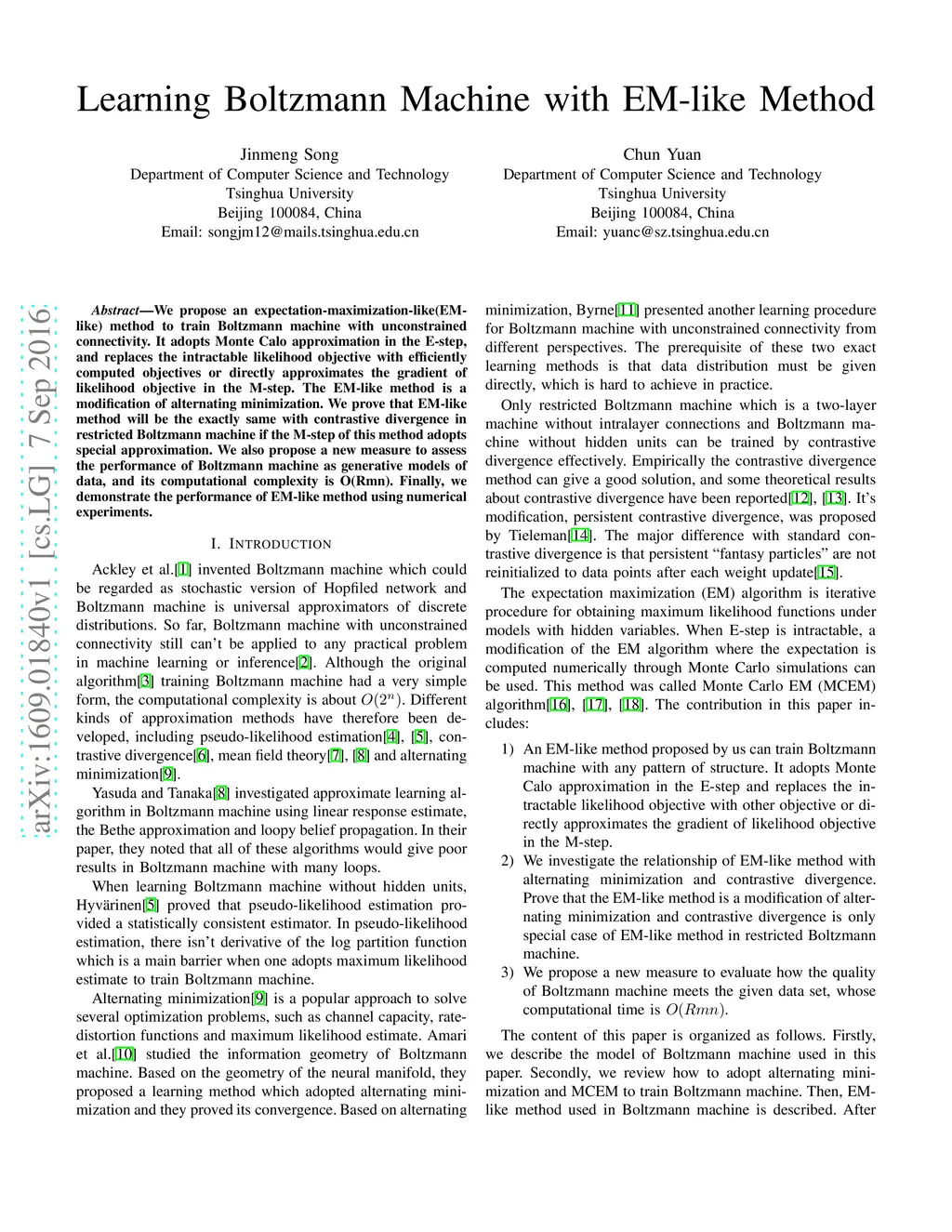 We propose an expectation-maximization-like(EMlike) method to train Boltzmann machine with unconstrained connectivity. It adopts Monte Carlo approximation in the E-step, and replaces the intractable likelihood objective with efficiently computed objectives or directly approximates the gradient of likelihood objective in the M-step. The EM-like method is a modification of alternating minimization. We prove that EM-like method will be the exactly same with contrastive divergence in restricted Boltzmann machine if the M-step of this method adopts special approximation. We also propose a new measure to assess the performance of Boltzmann machine as generative models of data, and its computational complexity is O(Rmn). Finally, we demonstrate the performance of EM-like method using numerical experiments.