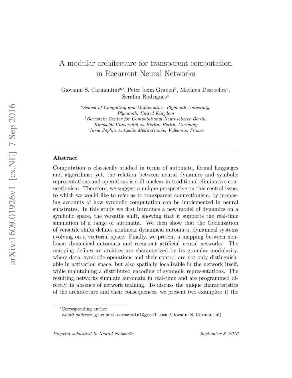 Computation is classically studied in terms of automata, formal languages and algorithms; yet, the relation between neural dynamics and symbolic representations and operations is still unclear in traditional eliminative connectionism. Therefore, we suggest a unique perspective on this central issue, to which we would like to refer as to transparent connectionism, by proposing accounts of how symbolic computation can be implemented in neural substrates. In this study we first introduce a new model of dynamics on a symbolic space, the versatile shift, showing that it supports the real-time simulation of a range of automata. We then show that the Goedelization of versatile shifts defines nonlinear dynamical automata, dynamical systems evolving on a vectorial space. Finally, we present a mapping between nonlinear dynamical automata and recurrent artificial neural networks. The mapping defines an architecture characterized by its granular modularity, where data, symbolic operations and their control are not only distinguishable in activation space, but also spatially localizable in the network itself, while maintaining a distributed encoding of symbolic representations. The resulting networks simulate automata in real-time and are programmed directly, in absence of network training. To discuss the unique characteristics of the architecture and their consequences, we present two examples: i) the design of a Central Pattern Generator from a finite-state locomotive controller, and ii) the creation of a network simulating a system of interactive automata that supports the parsing of garden-path sentences as investigated in psycholinguistics experiments.