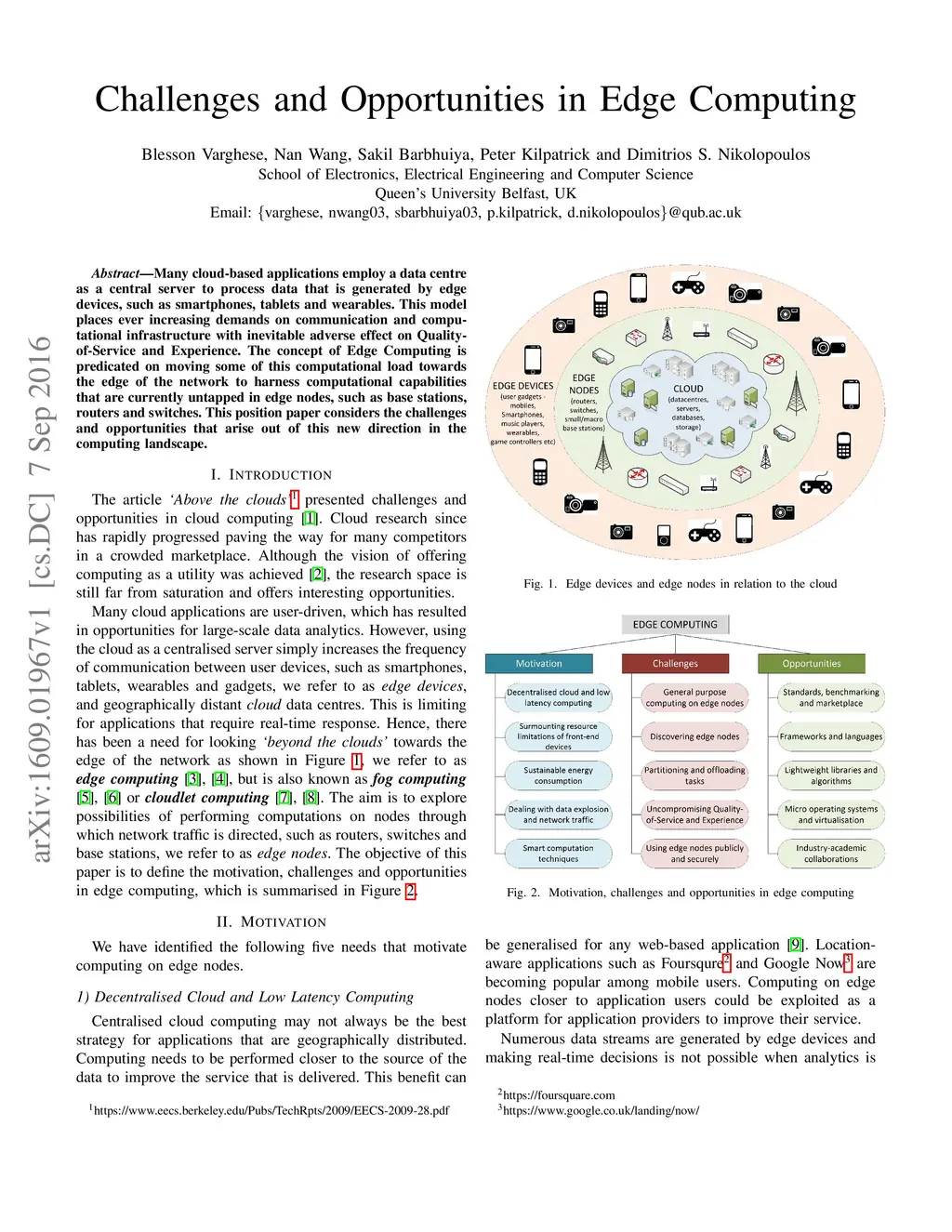 Many cloud-based applications employ a data centre as a central server to process data that is generated by edge devices, such as smartphones, tablets and wearables. This model places ever increasing demands on communication and computational infrastructure with inevitable adverse effect on Quality-of-Service and Experience. The concept of Edge Computing is predicated on moving some of this computational load towards the edge of the network to harness computational capabilities that are currently untapped in edge nodes, such as base stations, routers and switches. This position paper considers the challenges and opportunities that arise out of this new direction in the computing landscape.