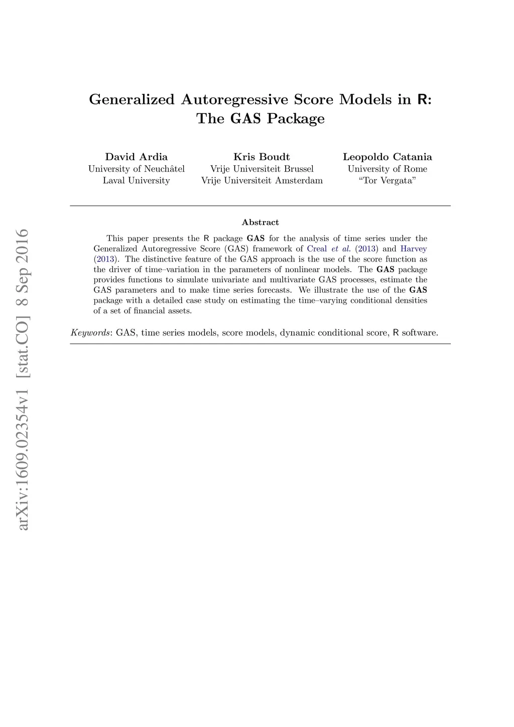 This paper presents the R package GAS for the analysis of time series under the Generalized Autoregressive Score (GAS) framework of Creal et al. (2013) and Harvey (2013). The distinctive feature of the GAS approach is the use of the score function as the driver of time-variation in the parameters of nonlinear models. The GAS package provides functions to simulate univariate and multivariate GAS processes, estimate the GAS parameters and to make time series forecasts. We illustrate the use of the GAS package with a detailed case study on estimating the time-varying conditional densities of a set of financial assets.
