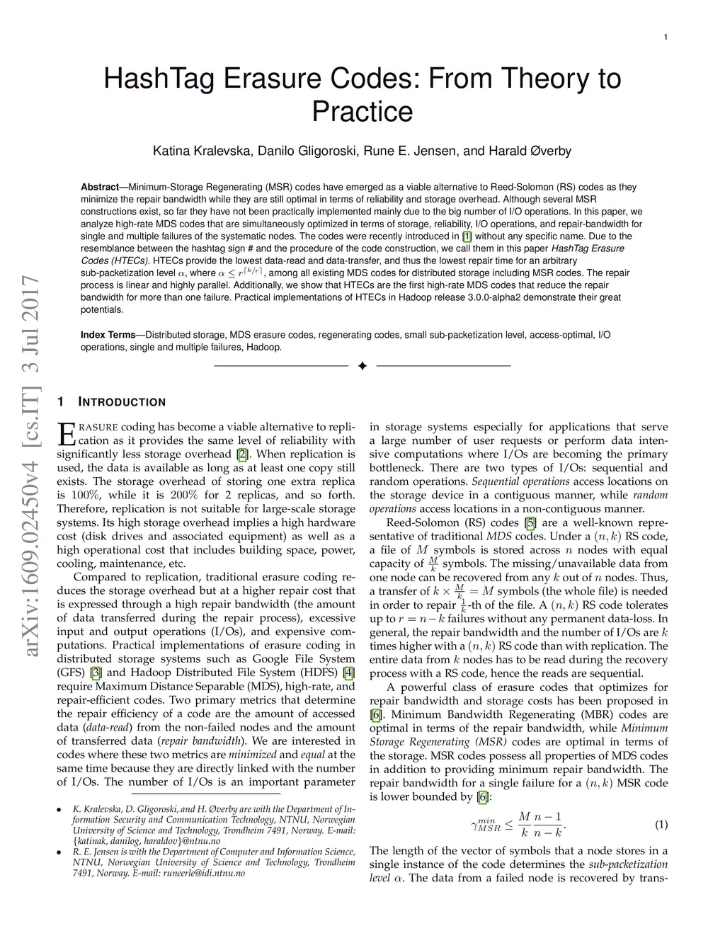 Minimum-Storage Regenerating (MSR) codes have emerged as a viable alternative to Reed-Solomon (RS) codes as they minimize the repair bandwidth while they are still optimal in terms of reliability and storage overhead. Although several MSR constructions exist, so far they have not been practically implemented mainly due to the big number of I/O operations. In this paper, we analyze high-rate MDS codes that are simultaneously optimized in terms of storage, reliability, I/O operations, and repair-bandwidth for single and multiple failures of the systematic nodes. The codes were recently introduced in \cite{7463553} without any specific name. Due to the resemblance between the hashtag sign \# and the procedure of the code construction, we call them in this paper \emph{HashTag Erasure Codes (HTECs)}. HTECs provide the lowest data-read and data-transfer, and thus the lowest repair time for an arbitrary sub-packetization level , where , among all existing MDS codes for distributed storage including MSR codes. The repair process is linear and highly parallel. Additionally, we show that HTECs are the first high-rate MDS codes that reduce the repair bandwidth for more than one failure. Practical implementations of HTECs in Hadoop release 3.0.0-alpha2 demonstrate their great potentials.