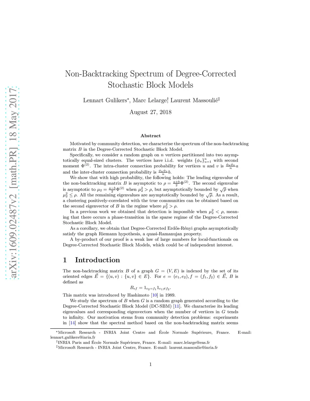 Motivated by community detection, we characterise the spectrum of the non-backtracking matrix in the Degree-Corrected Stochastic Block Model. Specifically, we consider a random graph on vertices partitioned into two equal-sized clusters. The vertices have i.i.d. weights with second moment . The intra-cluster connection probability for vertices and is and the inter-cluster connection probability is . We show that with high probability, the following holds: The leading eigenvalue of the non-backtracking matrix is asymptotic to . The second eigenvalue is asymptotic to when , but asymptotically bounded by when . All the remaining eigenvalues are asymptotically bounded by . As a result, a clustering positively-correlated with the true communities can be obtained based on the second eigenvector of in the regime where In a previous work we obtained that detection is impossible when meaning that there occurs a phase-transition in the sparse regime of the Degree-Corrected Stochastic Block Model. As a corollary, we obtain that Degree-Corrected Erd\H{o}s-R\'enyi graphs asymptotically satisfy the graph Riemann hypothesis, a quasi-Ramanujan property. A by-product of our proof is a weak law of large numbers for local-functionals on Degree-Corrected Stochastic Block Models, which could be of independent interest.