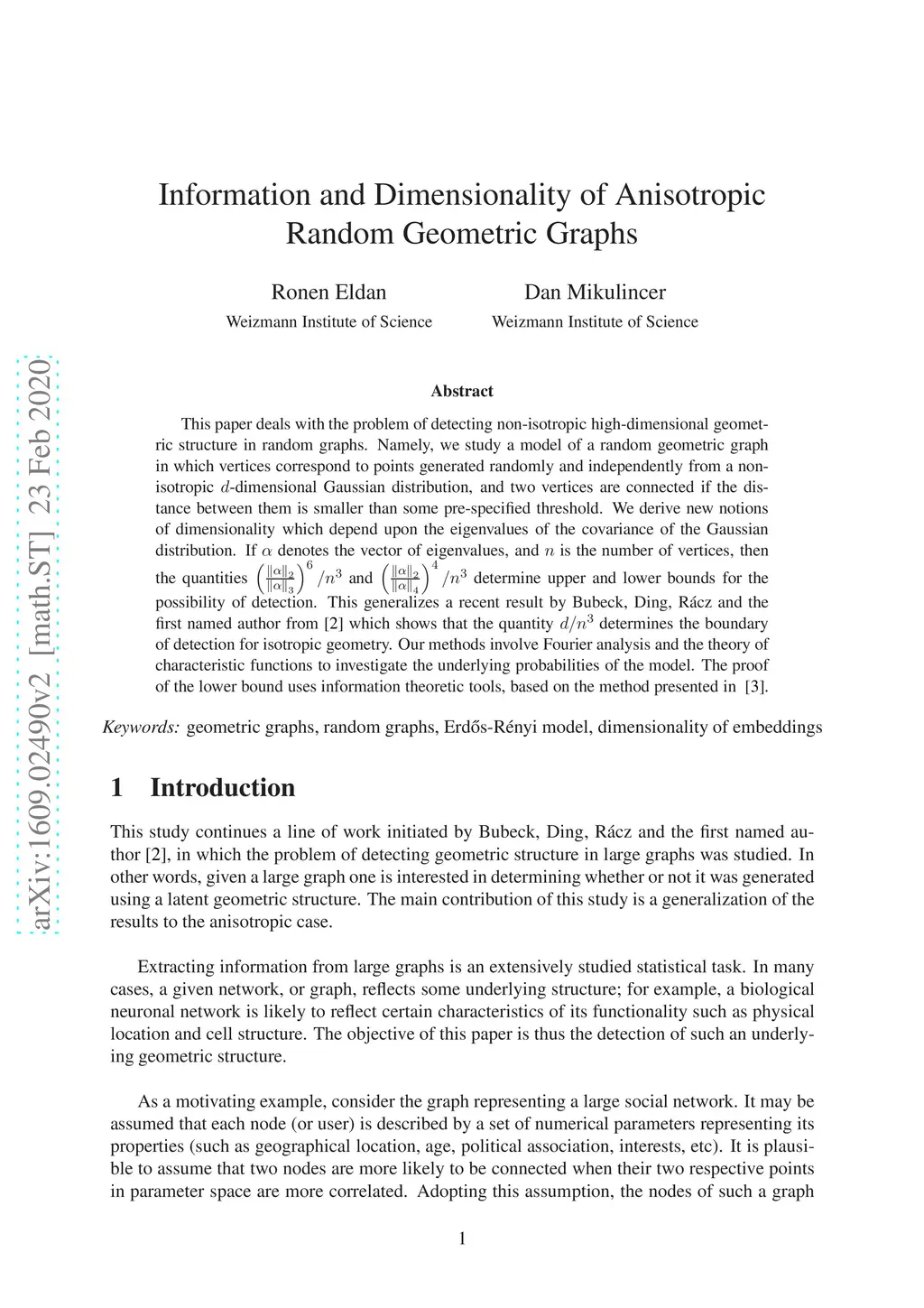 This paper deals with the problem of detecting non-isotropic high-dimensional geometric structure in random graphs. Namely, we study a model of a random geometric graph in which vertices correspond to points generated randomly and independently from a non-isotropic -dimensional Gaussian distribution, and two vertices are connected if the distance between them is smaller than some pre-specified threshold. We derive new notions of dimensionality which depend upon the eigenvalues of the covariance of the Gaussian distribution. If denotes the vector of eigenvalues, and is the number of vertices, then the quantities and determine upper and lower bounds for the possibility of detection. This generalizes a recent result by Bubeck, Ding, R\ácz and the first named author from [BDER14] which shows that the quantity determines the boundary of detection for isotropic geometry. Our methods involve Fourier analysis and the theory of characteristic functions to investigate the underlying probabilities of the model. The proof of the lower bound uses information theoretic tools, based on the method presented in [BG15].