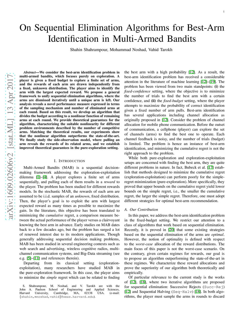 We consider the best-arm identification problem in multi-armed bandits, which focuses purely on exploration. A player is given a fixed budget to explore a finite set of arms, and the rewards of each arm are drawn independently from a fixed, unknown distribution. The player aims to identify the arm with the largest expected reward. We propose a general framework to unify sequential elimination algorithms, where the arms are dismissed iteratively until a unique arm is left. Our analysis reveals a novel performance measure expressed in terms of the sampling mechanism and number of eliminated arms at each round. Based on this result, we develop an algorithm that divides the budget according to a nonlinear function of remaining arms at each round. We provide theoretical guarantees for the algorithm, characterizing the suitable nonlinearity for different problem environments described by the number of competitive arms. Matching the theoretical results, our experiments show that the nonlinear algorithm outperforms the state-of-the-art. We finally study the side-observation model, where pulling an arm reveals the rewards of its related arms, and we establish improved theoretical guarantees in the pure-exploration setting.