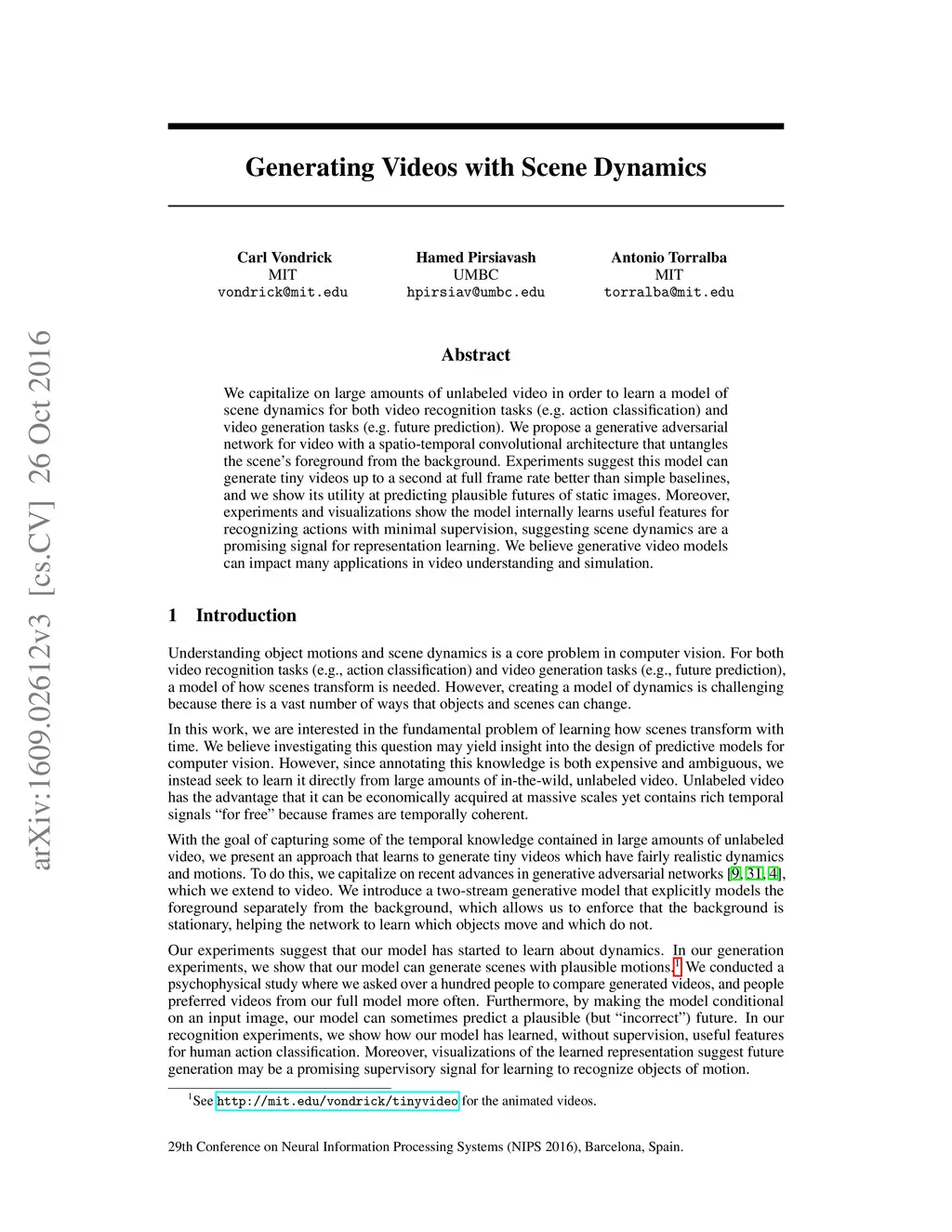 We capitalize on large amounts of unlabeled video in order to learn a model of scene dynamics for both video recognition tasks (e.g. action classification) and video generation tasks (e.g. future prediction). We propose a generative adversarial network for video with a spatio-temporal convolutional architecture that untangles the scene's foreground from the background. Experiments suggest this model can generate tiny videos up to a second at full frame rate better than simple baselines, and we show its utility at predicting plausible futures of static images. Moreover, experiments and visualizations show the model internally learns useful features for recognizing actions with minimal supervision, suggesting scene dynamics are a promising signal for representation learning. We believe generative video models can impact many applications in video understanding and simulation.