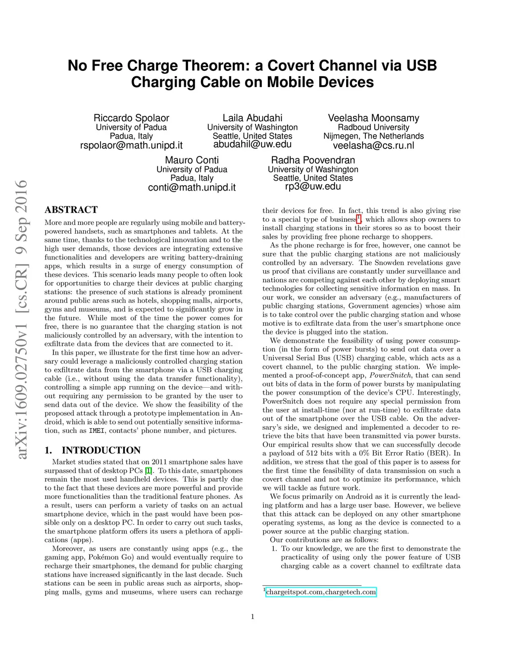 No Free Charge Theorem: a Covert Channel via USB Charging Cable on