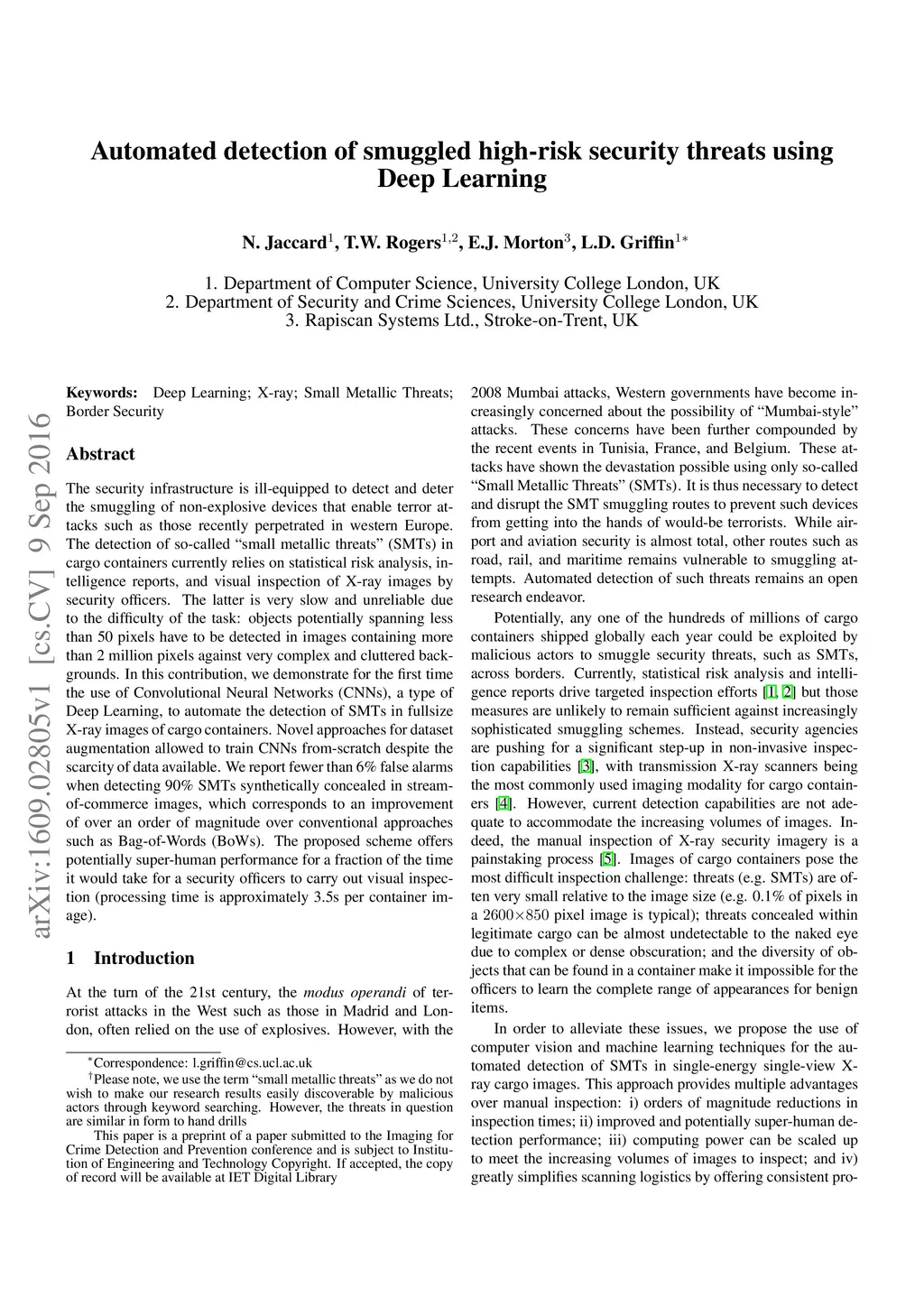The security infrastructure is ill-equipped to detect and deter the smuggling of non-explosive devices that enable terror attacks such as those recently perpetrated in western Europe. The detection of so-called "small metallic threats" (SMTs) in cargo containers currently relies on statistical risk analysis, intelligence reports, and visual inspection of X-ray images by security officers. The latter is very slow and unreliable due to the difficulty of the task: objects potentially spanning less than 50 pixels have to be detected in images containing more than 2 million pixels against very complex and cluttered backgrounds. In this contribution, we demonstrate for the first time the use of Convolutional Neural Networks (CNNs), a type of Deep Learning, to automate the detection of SMTs in fullsize X-ray images of cargo containers. Novel approaches for dataset augmentation allowed to train CNNs from-scratch despite the scarcity of data available. We report fewer than 6% false alarms when detecting 90% SMTs synthetically concealed in stream-of-commerce images, which corresponds to an improvement of over an order of magnitude over conventional approaches such as Bag-of-Words (BoWs). The proposed scheme offers potentially super-human performance for a fraction of the time it would take for a security officers to carry out visual inspection (processing time is approximately 3.5s per container image).