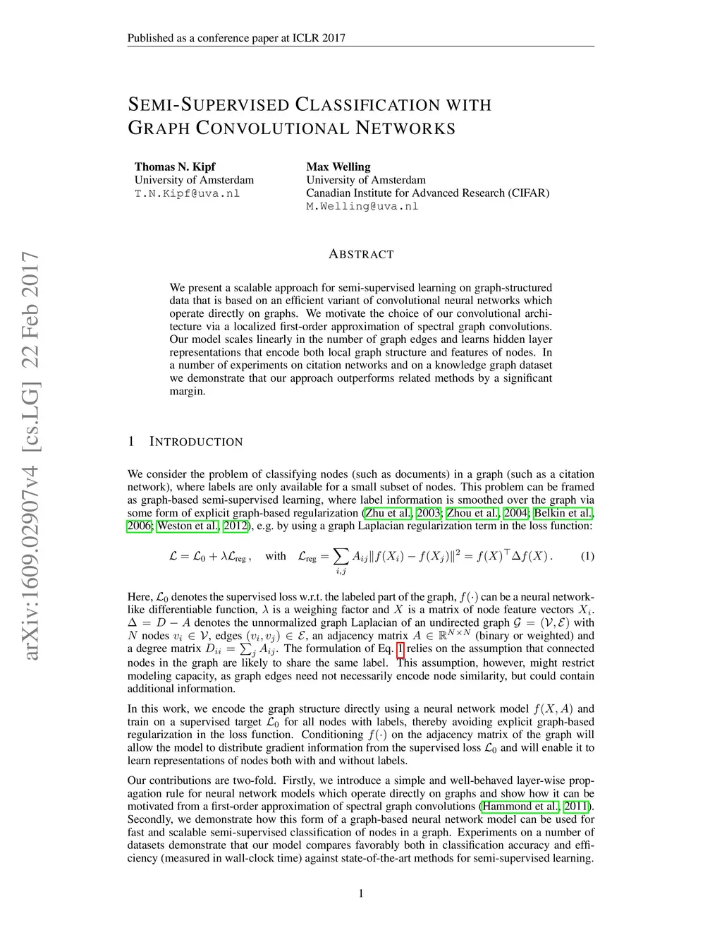 We present a scalable approach for semi-supervised learning on graph-structured data that is based on an efficient variant of convolutional neural networks which operate directly on graphs. We motivate the choice of our convolutional architecture via a localized first-order approximation of spectral graph convolutions. Our model scales linearly in the number of graph edges and learns hidden layer representations that encode both local graph structure and features of nodes. In a number of experiments on citation networks and on a knowledge graph dataset we demonstrate that our approach outperforms related methods by a significant margin.