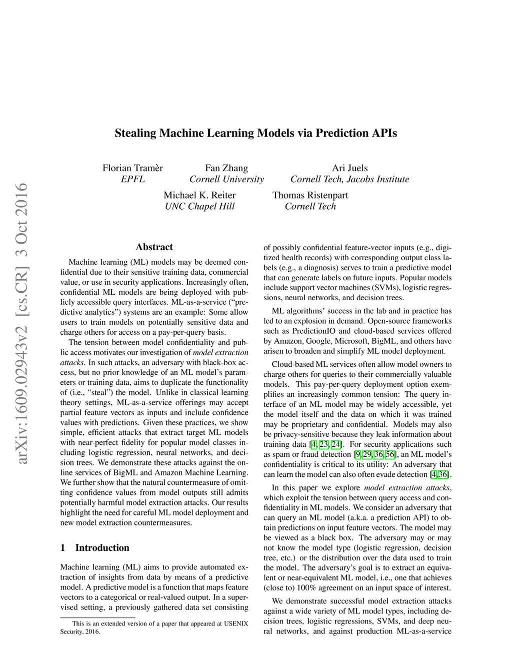 Machine learning (ML) models may be deemed confidential due to their sensitive training data, commercial value, or use in security applications. Increasingly often, confidential ML models are being deployed with publicly accessible query interfaces. ML-as-a-service ("predictive analytics") systems are an example: Some allow users to train models on potentially sensitive data and charge others for access on a pay-per-query basis. The tension between model confidentiality and public access motivates our investigation of model extraction attacks. In such attacks, an adversary with black-box access, but no prior knowledge of an ML model's parameters or training data, aims to duplicate the functionality of (i.e., "steal") the model. Unlike in classical learning theory settings, ML-as-a-service offerings may accept partial feature vectors as inputs and include confidence values with predictions. Given these practices, we show simple, efficient attacks that extract target ML models with near-perfect fidelity for popular model classes including logistic regression, neural networks, and decision trees. We demonstrate these attacks against the online services of BigML and Amazon Machine Learning. We further show that the natural countermeasure of omitting confidence values from model outputs still admits potentially harmful model extraction attacks. Our results highlight the need for careful ML model deployment and new model extraction countermeasures.