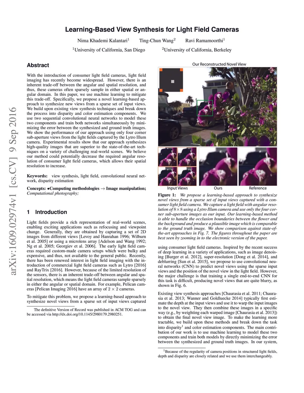 With the introduction of consumer light field cameras, light field imaging has recently become widespread. However, there is an inherent trade-off between the angular and spatial resolution, and thus, these cameras often sparsely sample in either spatial or angular domain. In this paper, we use machine learning to mitigate this trade-off. Specifically, we propose a novel learning-based approach to synthesize new views from a sparse set of input views. We build upon existing view synthesis techniques and break down the process into disparity and color estimation components. We use two sequential convolutional neural networks to model these two components and train both networks simultaneously by minimizing the error between the synthesized and ground truth images. We show the performance of our approach using only four corner sub-aperture views from the light fields captured by the Lytro Illum camera. Experimental results show that our approach synthesizes high-quality images that are superior to the state-of-the-art techniques on a variety of challenging real-world scenes. We believe our method could potentially decrease the required angular resolution of consumer light field cameras, which allows their spatial resolution to increase.