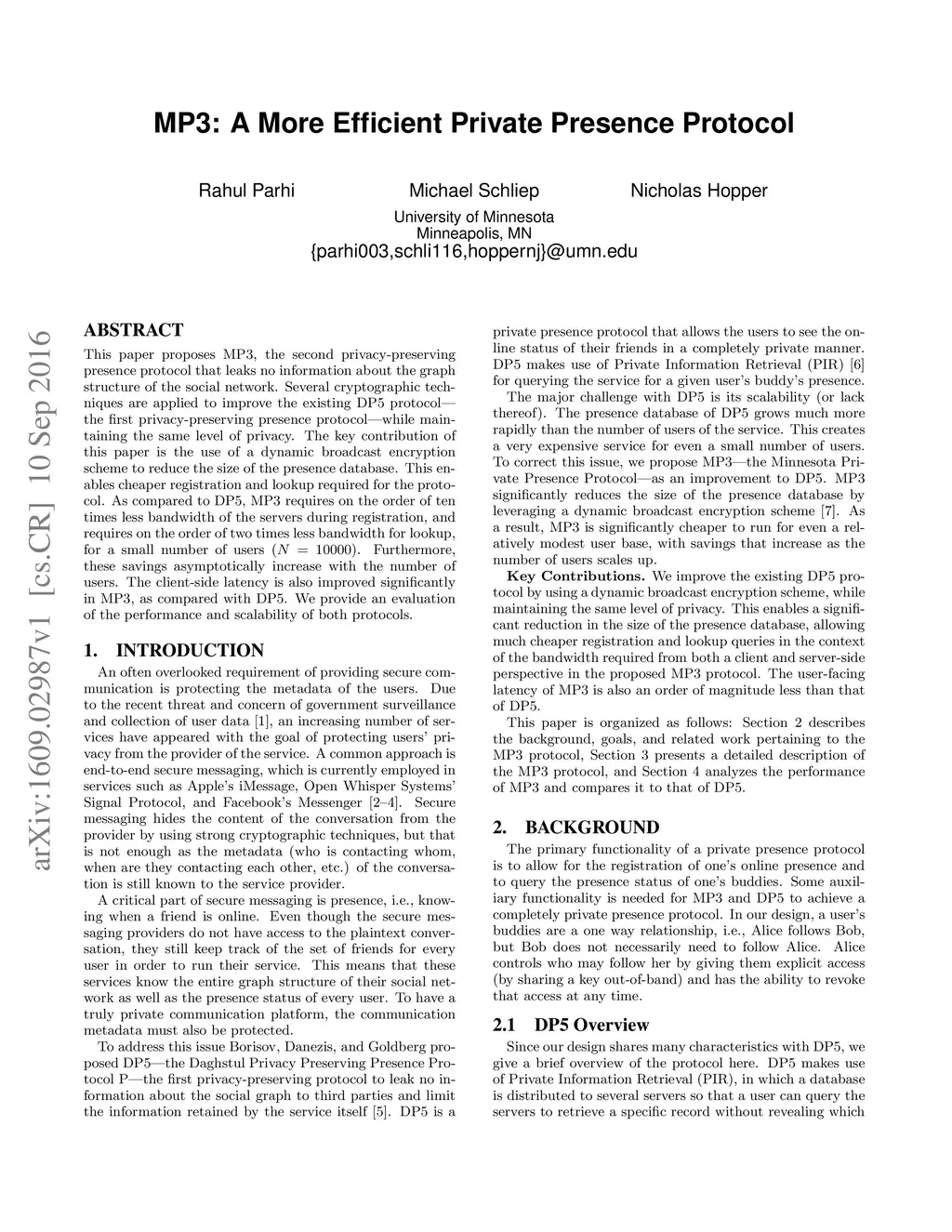 This paper proposes MP3, the second privacy-preserving presence protocol that leaks no information about the graph structure of the social network. Several cryptographic techniques are applied to improve the existing DP5 protocol---the first privacy-preserving presence protocol---while maintaining the same level of privacy. The key contribution of this paper is the use of a dynamic broadcast encryption scheme to reduce the size of the presence database. This enables cheaper registration and lookup required for the protocol. As compared to DP5, MP3 requires on the order of ten times less bandwidth of the servers during registration, and requires on the order of two times less bandwidth for lookup, for a small number of users (). Furthermore, these savings asymptotically increase with the number of users. The client-side latency is also improved significantly in MP3, as compared with DP5. We provide an evaluation of the performance and scalability of both protocols.