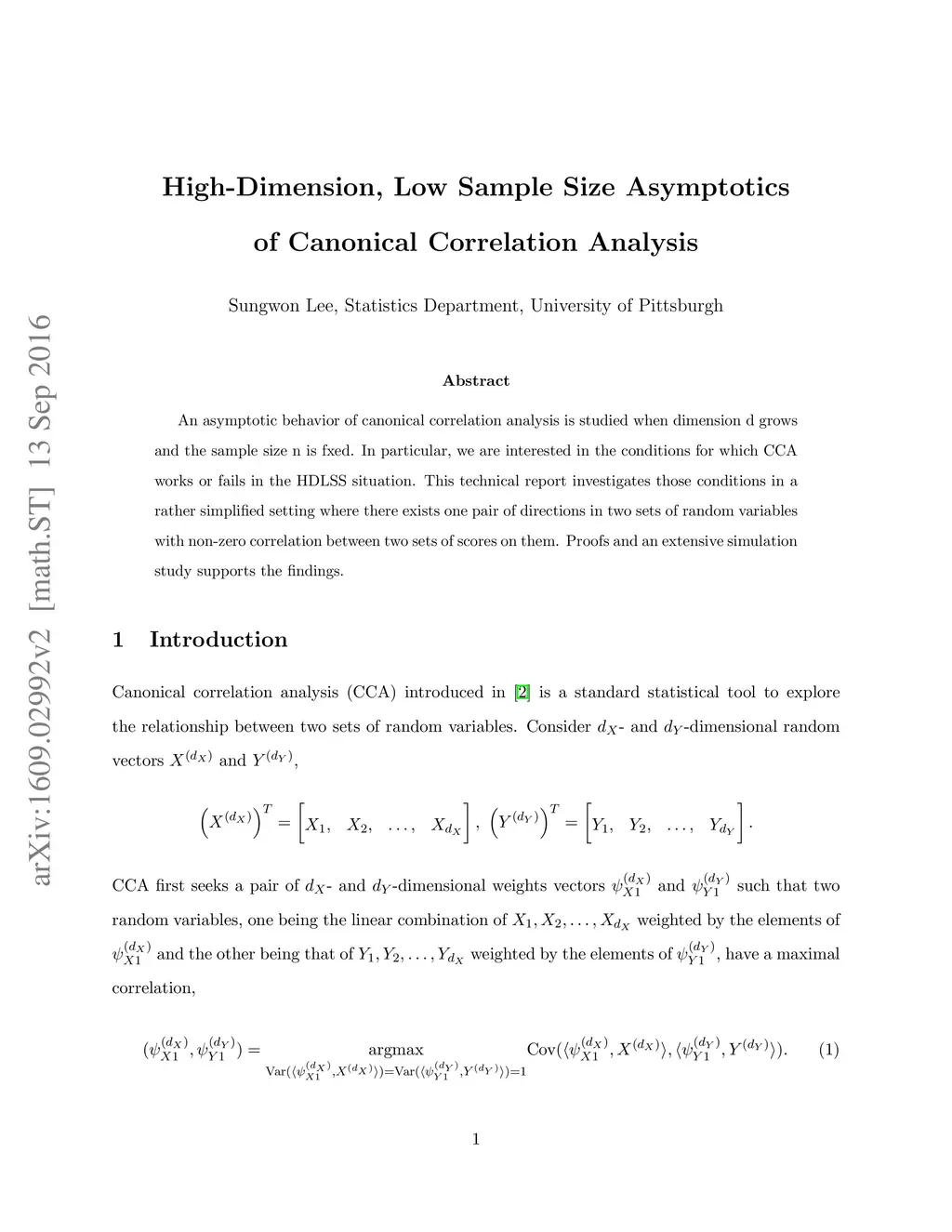 An asymptotic behavior of canonical correlation analysis is studied when dimension d grows and the sample size n is fxed. In particular, we are interested in the conditions for which CCA works or fails in the HDLSS situation. This technical report investigates those conditions in a rather simplified setting where there exists one pair of directions in two sets of random variables with non-zero correlation between two sets of scores on them. Proofs and an extensive simulation study supports the findings.