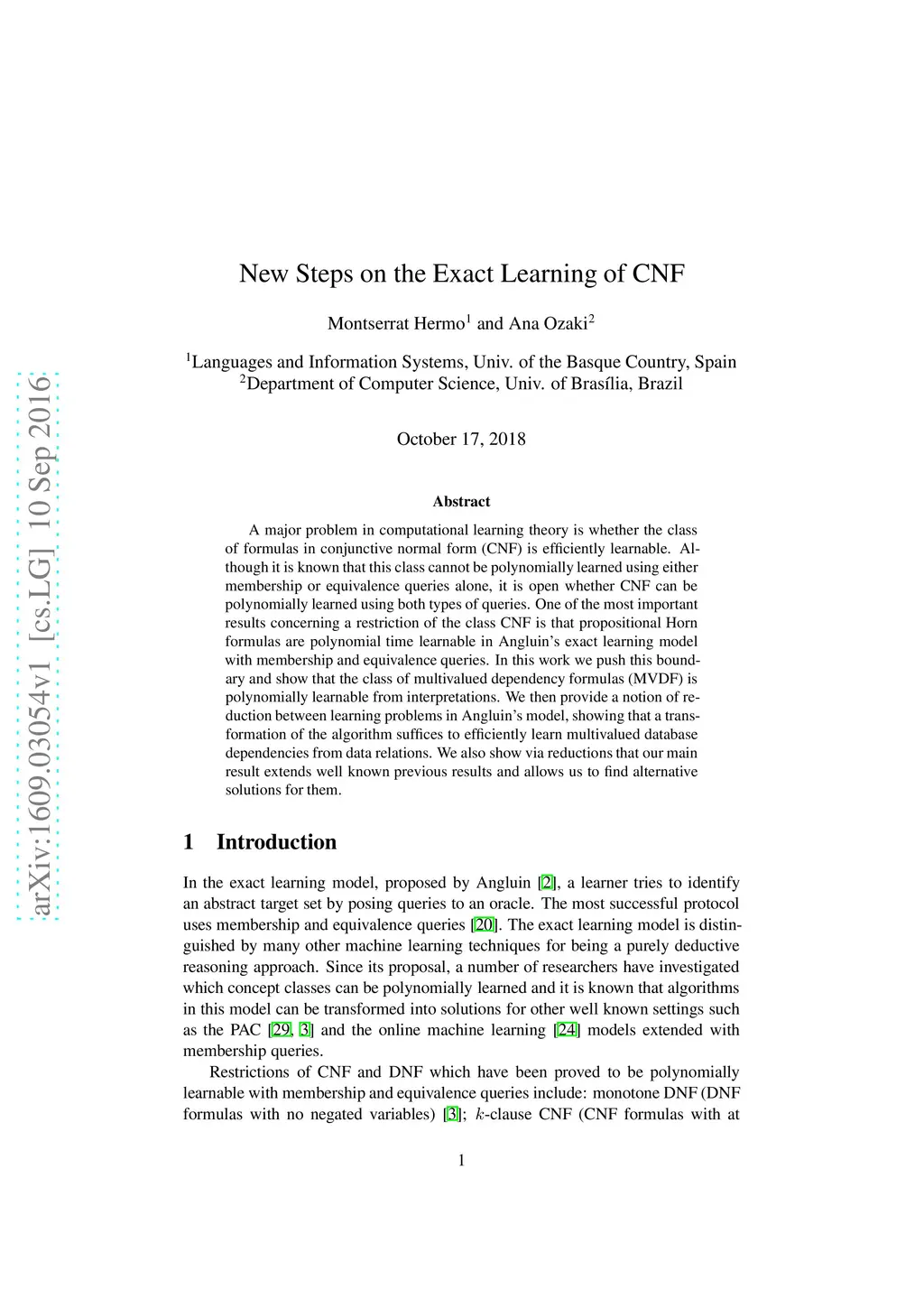 A major problem in computational learning theory is whether the class of formulas in conjunctive normal form (CNF) is efficiently learnable. Although it is known that this class cannot be polynomially learned using either membership or equivalence queries alone, it is open whether CNF can be polynomially learned using both types of queries. One of the most important results concerning a restriction of the class CNF is that propositional Horn formulas are polynomial time learnable in Angluin's exact learning model with membership and equivalence queries. In this work we push this boundary and show that the class of multivalued dependency formulas (MVDF) is polynomially learnable from interpretations. We then provide a notion of reduction between learning problems in Angluin's model, showing that a transformation of the algorithm suffices to efficiently learn multivalued database dependencies from data relations. We also show via reductions that our main result extends well known previous results and allows us to find alternative solutions for them.