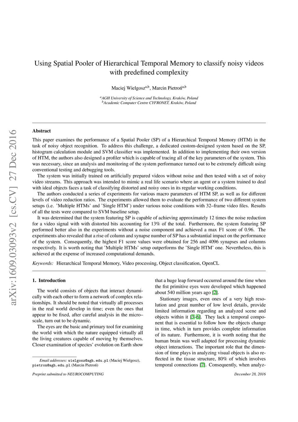 This paper examines the performance of a Spatial Pooler (SP) of a Hierarchical Temporal Memory (HTM) in the task of noisy object recognition. To address this challenge, a dedicated custom-designed system based on the SP, histogram calculation module and SVM classifier was implemented. In addition to implementing their own version of HTM, the authors also designed a profiler which is capable of tracing all of the key parameters of the system. This was necessary, since an analysis and monitoring of the system performance turned out to be extremely difficult using conventional testing and debugging tools. The system was initially trained on artificially prepared videos without noise and then tested with a set of noisy video streams. This approach was intended to mimic a real life scenario where an agent or a system trained to deal with ideal objects faces a task of classifying distorted and noisy ones in its regular working conditions. The authors conducted a series of experiments for various macro parameters of HTM SP, as well as for different levels of video reduction ratios. The experiments allowed them to evaluate the performance of two different system setups (i.e. 'Multiple HTMs' and 'Single HTM') under various noise conditions with 32--frame video files. Results of all the tests were compared to SVM baseline setup. It was determined that the system featuring SP is capable of achieving approximately 12 times the noise reduction for a video signal with with distorted bits accounting for 13\% of the total. Furthermore, the system featuring SP performed better also in the experiments without a noise component and achieved a max F1 score of 0.96. The experiments also revealed that a rise of column and synapse number of SP has a substantial impact on the performance of the system. Consequently, the highest F1 score values were obtained for 256 and 4096 synapses and columns respectively.
