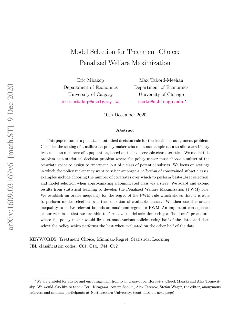 This paper studies a penalized statistical decision rule for the treatment assignment problem. Consider the setting of a utilitarian policy maker who must use sample data to allocate a binary treatment to members of a population, based on their observable characteristics. We model this problem as a statistical decision problem where the policy maker must choose a subset of the covariate space to assign to treatment, out of a class of potential subsets. We focus on settings in which the policy maker may want to select amongst a collection of constrained subset classes: examples include choosing the number of covariates over which to perform best-subset selection, and model selection when approximating a complicated class via a sieve. We adapt and extend results from statistical learning to develop the Penalized Welfare Maximization (PWM) rule. We establish an oracle inequality for the regret of the PWM rule which shows that it is able to perform model selection over the collection of available classes. We then use this oracle inequality to derive relevant bounds on maximum regret for PWM. An important consequence of our results is that we are able to formalize model-selection using a "hold-out" procedure, where the policy maker would first estimate various policies using half of the data, and then select the policy which performs the best when evaluated on the other half of the data.