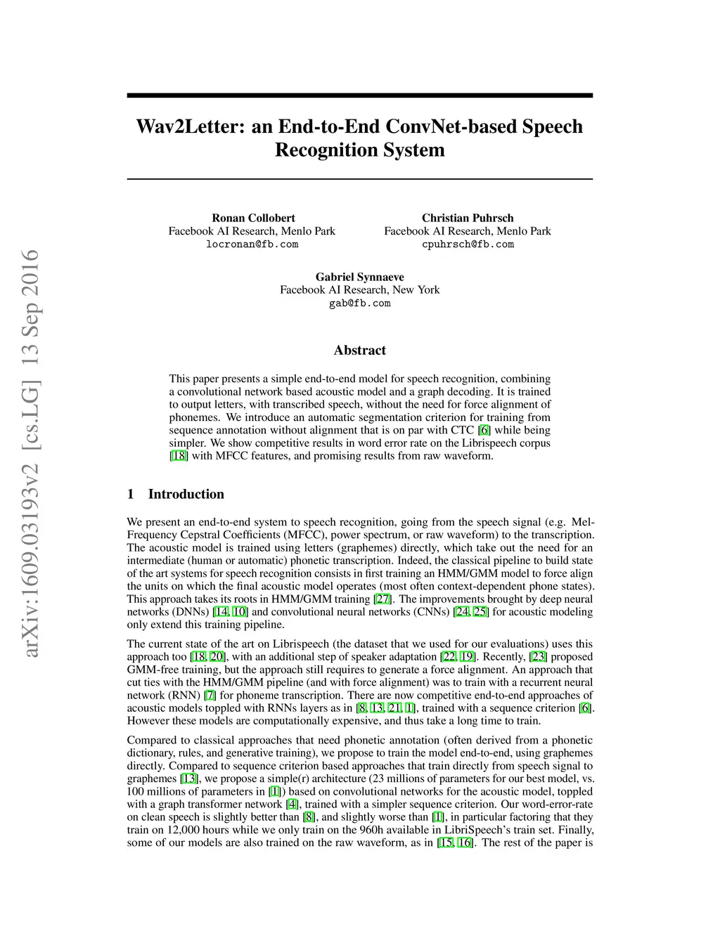 This paper presents a simple end-to-end model for speech recognition, combining a convolutional network based acoustic model and a graph decoding. It is trained to output letters, with transcribed speech, without the need for force alignment of phonemes. We introduce an automatic segmentation criterion for training from sequence annotation without alignment that is on par with CTC while being simpler. We show competitive results in word error rate on the Librispeech corpus with MFCC features, and promising results from raw waveform.
