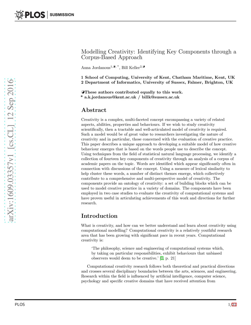 Modelling Creativity: Identifying Key Components through a Corpus-Based