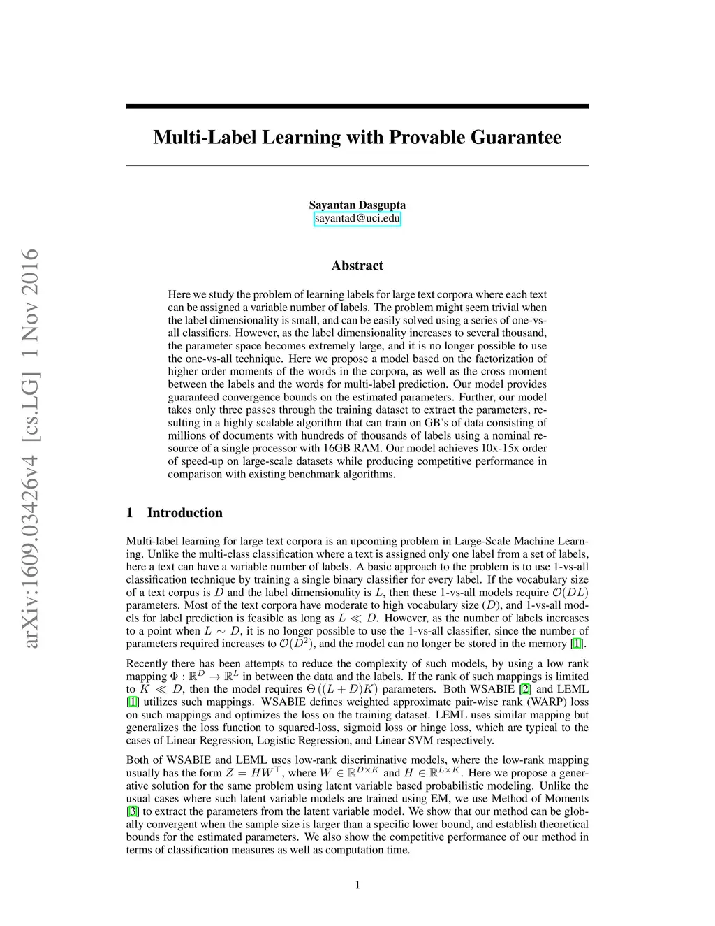 Here we study the problem of learning labels for large text corpora where each text can be assigned a variable number of labels. The problem might seem trivial when the label dimensionality is small and can be easily solved using a series of one-vs-all classifiers. However, as the label dimensionality increases to several thousand, the parameter space becomes extremely large, and it is no longer possible to use the one-vs-all technique. Here we propose a model based on the factorization of higher order moments of the words in the corpora, as well as the cross moment between the labels and the words for multi-label prediction. Our model provides guaranteed convergence bounds on the estimated parameters. Further, our model takes only three passes through the training dataset to extract the parameters, resulting in a highly scalable algorithm that can train on GB's of data consisting of millions of documents with hundreds of thousands of labels using a nominal resource of a single processor with 16GB RAM. Our model achieves 10x-15x order of speed-up on large-scale datasets while producing competitive performance in comparison with existing benchmark algorithms.