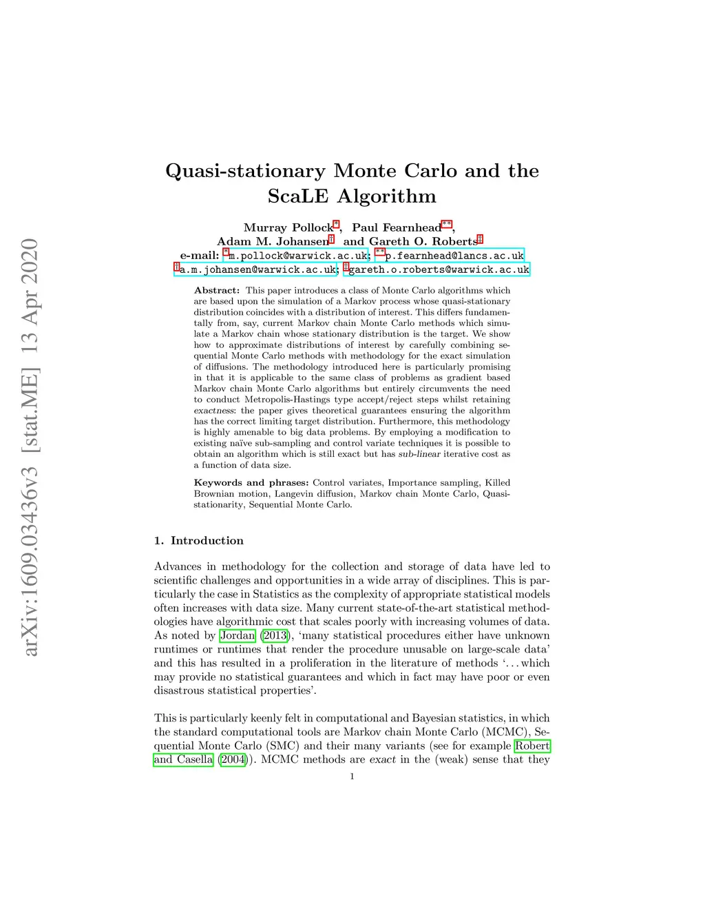 This paper introduces a class of Monte Carlo algorithms which are based upon the simulation of a Markov process whose quasi-stationary distribution coincides with a distribution of interest. This differs fundamentally from, say, current Markov chain Monte Carlo methods which simulate a Markov chain whose stationary distribution is the target. We show how to approximate distributions of interest by carefully combining sequential Monte Carlo methods with methodology for the exact simulation of diffusions. The methodology introduced here is particularly promising in that it is applicable to the same class of problems as gradient based Markov chain Monte Carlo algorithms but entirely circumvents the need to conduct Metropolis-Hastings type accept/reject steps whilst retaining exactness: the paper gives theoretical guarantees ensuring the algorithm has the correct limiting target distribution. Furthermore, this methodology is highly amenable to big data problems. By employing a modification to existing na{\"\i}ve sub-sampling and control variate techniques it is possible to obtain an algorithm which is still exact but has sub-linear iterative cost as a function of data size.