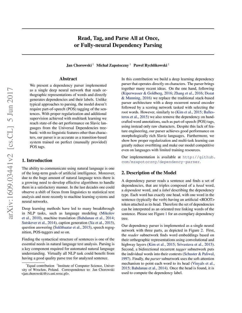 We present a dependency parser implemented as a single deep neural network that reads orthographic representations of words and directly generates dependencies and their labels. Unlike typical approaches to parsing, the model doesn't require part-of-speech (POS) tagging of the sentences. With proper regularization and additional supervision achieved with multitask learning we reach state-of-the-art performance on Slavic languages from the Universal Dependencies treebank: with no linguistic features other than characters, our parser is as accurate as a transition- based system trained on perfect POS tags.