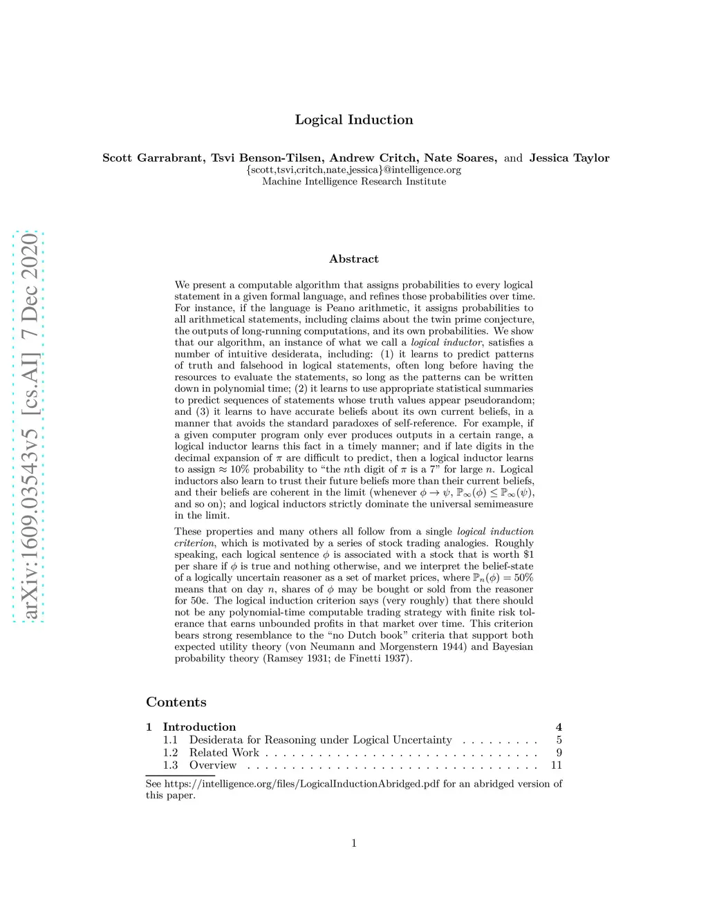 We present a computable algorithm that assigns probabilities to every logical statement in a given formal language, and refines those probabilities over time. For instance, if the language is Peano arithmetic, it assigns probabilities to all arithmetical statements, including claims about the twin prime conjecture, the outputs of long-running computations, and its own probabilities. We show that our algorithm, an instance of what we call a logical inductor, satisfies a number of intuitive desiderata, including: (1) it learns to predict patterns of truth and falsehood in logical statements, often long before having the resources to evaluate the statements, so long as the patterns can be written down in polynomial time; (2) it learns to use appropriate statistical summaries to predict sequences of statements whose truth values appear pseudorandom; and (3) it learns to have accurate beliefs about its own current beliefs, in a manner that avoids the standard paradoxes of self-reference. For example, if a given computer program only ever produces outputs in a certain range, a logical inductor learns this fact in a timely manner; and if late digits in the decimal expansion of are difficult to predict, then a logical inductor learns to assign probability to "the th digit of is a 7" for large . Logical inductors also learn to trust their future beliefs more than their current beliefs, and their beliefs are coherent in the limit (whenever , , and so on); and logical inductors strictly dominate the universal semimeasure in the limit. These properties and many others all follow from a single logical induction criterion, which is motivated by a series of stock trading analogies. Roughly speaking, each logical sentence is associated with a stock that is worth \$1 per share if [...]