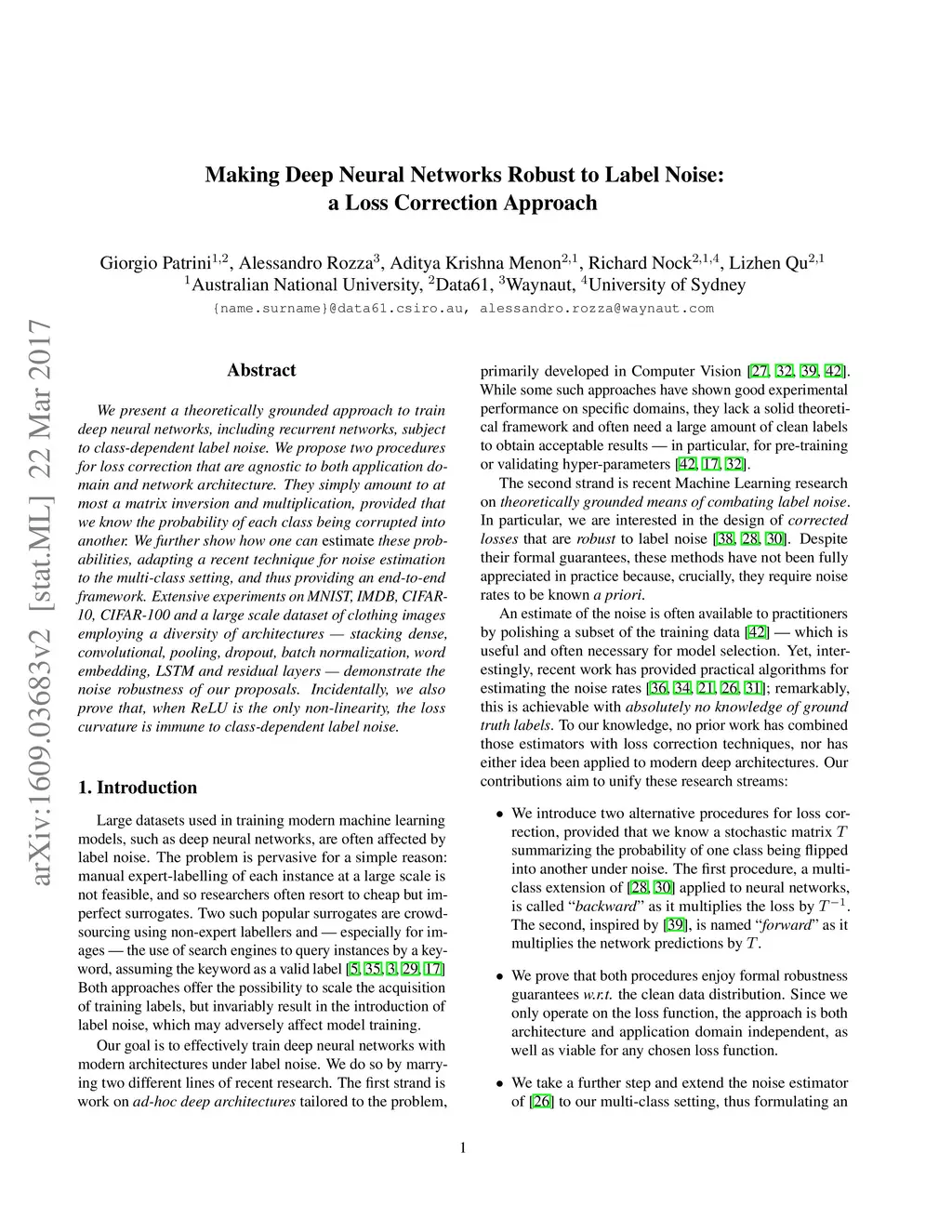 We present a theoretically grounded approach to train deep neural networks, including recurrent networks, subject to class-dependent label noise. We propose two procedures for loss correction that are agnostic to both application domain and network architecture. They simply amount to at most a matrix inversion and multiplication, provided that we know the probability of each class being corrupted into another. We further show how one can estimate these probabilities, adapting a recent technique for noise estimation to the multi-class setting, and thus providing an end-to-end framework. Extensive experiments on MNIST, IMDB, CIFAR-10, CIFAR-100 and a large scale dataset of clothing images employing a diversity of architectures --- stacking dense, convolutional, pooling, dropout, batch normalization, word embedding, LSTM and residual layers --- demonstrate the noise robustness of our proposals. Incidentally, we also prove that, when ReLU is the only non-linearity, the loss curvature is immune to class-dependent label noise.