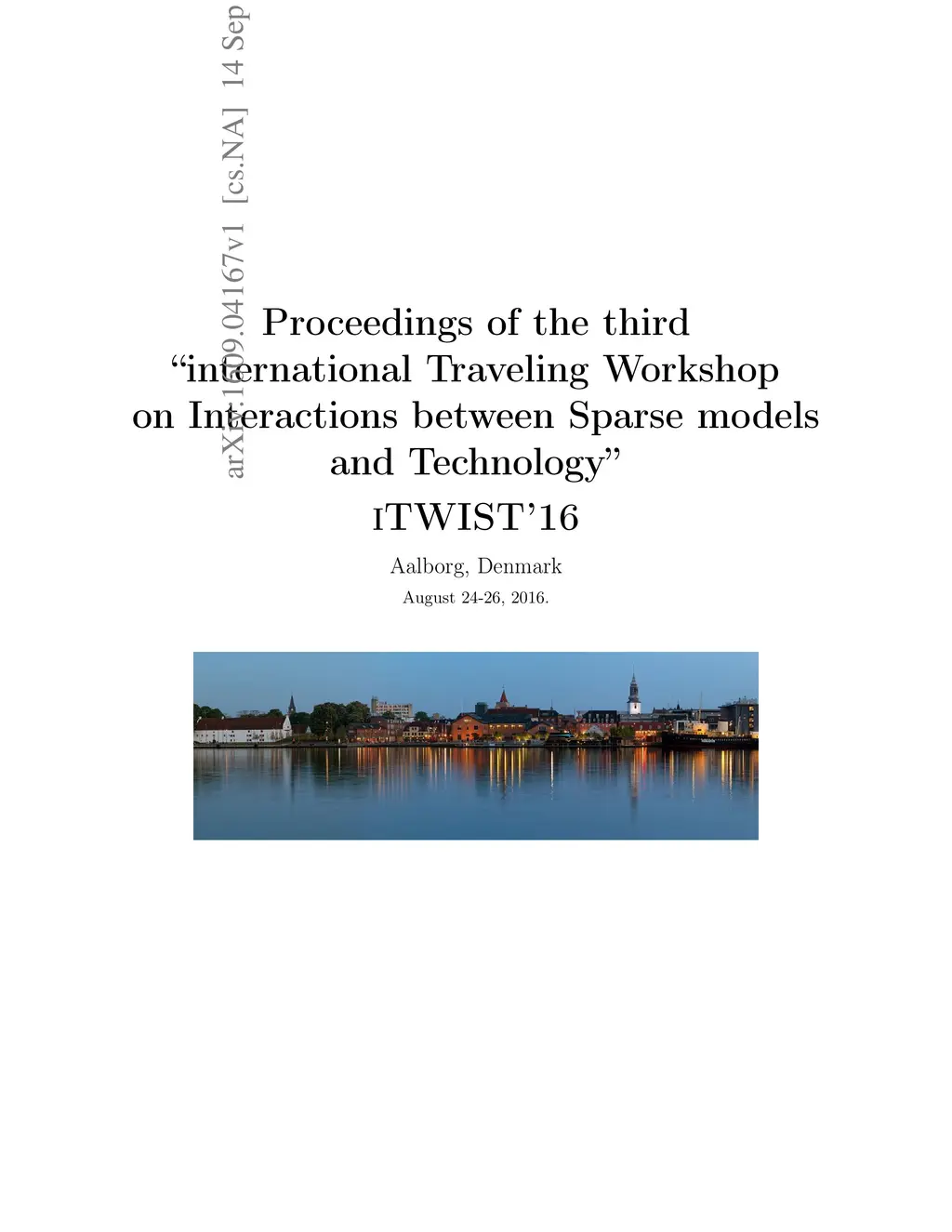 The third edition of the "international - Traveling Workshop on Interactions between Sparse models and Technology" (iTWIST) took place in Aalborg, the 4th largest city in Denmark situated beautifully in the northern part of the country, from the 24th to 26th of August 2016. The workshop venue was at the Aalborg University campus. One implicit objective of this biennial workshop is to foster collaboration between international scientific teams by disseminating ideas through both specific oral/poster presentations and free discussions. For this third edition, iTWIST'16 gathered about 50 international participants and features 8 invited talks, 12 oral presentations, and 12 posters on the following themes, all related to the theory, application and generalization of the "sparsity paradigm": Sparsity-driven data sensing and processing (e.g., optics, computer vision, genomics, biomedical, digital communication, channel estimation, astronomy); Application of sparse models in non-convex/non-linear inverse problems (e.g., phase retrieval, blind deconvolution, self calibration); Approximate probabilistic inference for sparse problems; Sparse machine learning and inference; "Blind" inverse problems and dictionary learning; Optimization for sparse modelling; Information theory, geometry and randomness; Sparsity? What's next? (Discrete-valued signals; Union of low-dimensional spaces, Cosparsity, mixed/group norm, model-based, low-complexity models, ...); Matrix/manifold sensing/processing (graph, low-rank approximation, ...); Complexity/accuracy tradeoffs in numerical methods/optimization; Electronic/optical compressive sensors (hardware).