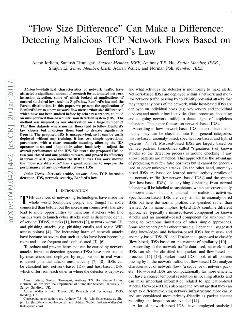 Statistical characteristics of network traffic have attracted a significant amount of research for automated network intrusion detection, some of which looked at applications of natural statistical laws such as Zipf's law, Benford's law and the Pareto distribution. In this paper, we present the application of Benford's law to a new network flow metric "flow size difference", which have not been studied before by other researchers, to build an unsupervised flow-based intrusion detection system (IDS). The method was inspired by our observation on a large number of TCP flow datasets where normal flows tend to follow Benford's law closely but malicious flows tend to deviate significantly from it. The proposed IDS is unsupervised, so it can be easily deployed without any training. It has two simple operational parameters with a clear semantic meaning, allowing the IDS operator to set and adapt their values intuitively to adjust the overall performance of the IDS. We tested the proposed IDS on two (one closed and one public) datasets, and proved its efficiency in terms of AUC (area under the ROC curve). Our work showed the "flow size difference" has a great potential to improve the performance of any flow-based network IDSs.