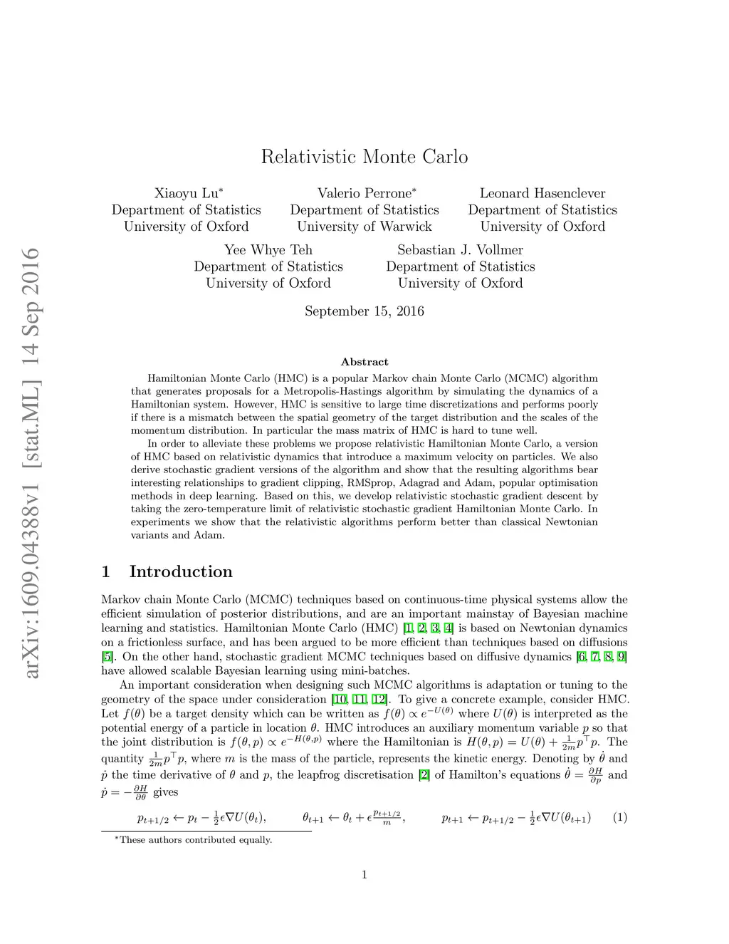 Hamiltonian Monte Carlo (HMC) is a popular Markov chain Monte Carlo (MCMC) algorithm that generates proposals for a Metropolis-Hastings algorithm by simulating the dynamics of a Hamiltonian system. However, HMC is sensitive to large time discretizations and performs poorly if there is a mismatch between the spatial geometry of the target distribution and the scales of the momentum distribution. In particular the mass matrix of HMC is hard to tune well. In order to alleviate these problems we propose relativistic Hamiltonian Monte Carlo, a version of HMC based on relativistic dynamics that introduce a maximum velocity on particles. We also derive stochastic gradient versions of the algorithm and show that the resulting algorithms bear interesting relationships to gradient clipping, RMSprop, Adagrad and Adam, popular optimisation methods in deep learning. Based on this, we develop relativistic stochastic gradient descent by taking the zero-temperature limit of relativistic stochastic gradient Hamiltonian Monte Carlo. In experiments we show that the relativistic algorithms perform better than classical Newtonian variants and Adam.