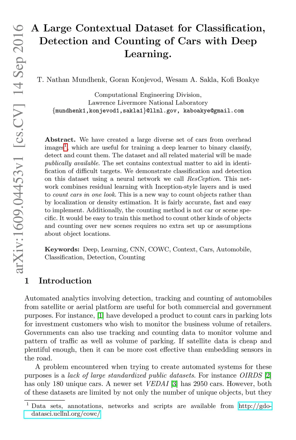 We have created a large diverse set of cars from overhead images, which are useful for training a deep learner to binary classify, detect and count them. The dataset and all related material will be made publically available. The set contains contextual matter to aid in identification of difficult targets. We demonstrate classification and detection on this dataset using a neural network we call ResCeption. This network combines residual learning with Inception-style layers and is used to count cars in one look. This is a new way to count objects rather than by localization or density estimation. It is fairly accurate, fast and easy to implement. Additionally, the counting method is not car or scene specific. It would be easy to train this method to count other kinds of objects and counting over new scenes requires no extra set up or assumptions about object locations.