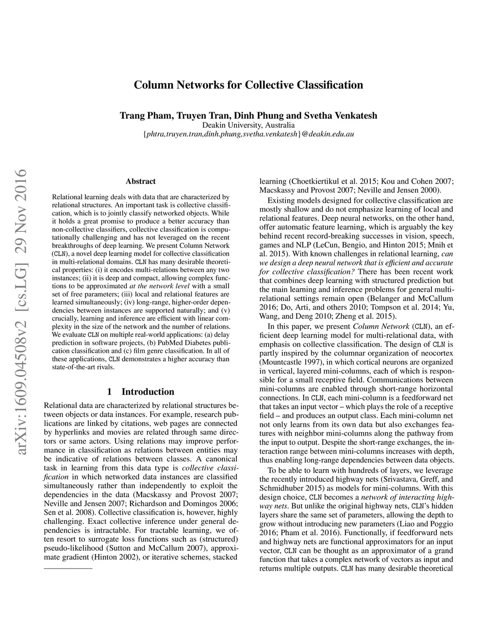 Relational learning deals with data that are characterized by relational structures. An important task is collective classification, which is to jointly classify networked objects. While it holds a great promise to produce a better accuracy than non-collective classifiers, collective classification is computational challenging and has not leveraged on the recent breakthroughs of deep learning. We present Column Network (CLN), a novel deep learning model for collective classification in multi-relational domains. CLN has many desirable theoretical properties: (i) it encodes multi-relations between any two instances; (ii) it is deep and compact, allowing complex functions to be approximated at the network level with a small set of free parameters; (iii) local and relational features are learned simultaneously; (iv) long-range, higher-order dependencies between instances are supported naturally; and (v) crucially, learning and inference are efficient, linear in the size of the network and the number of relations. We evaluate CLN on multiple real-world applications: (a) delay prediction in software projects, (b) PubMed Diabetes publication classification and (c) film genre classification. In all applications, CLN demonstrates a higher accuracy than state-of-the-art rivals.
