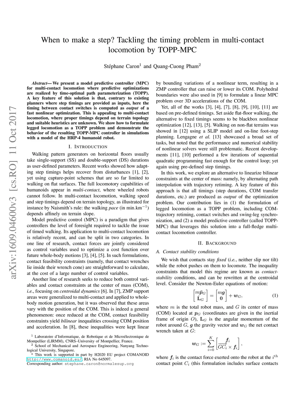 We present a model predictive controller (MPC) for multi-contact locomotion where predictive optimizations are realized by time-optimal path parameterization (TOPP). A key feature of this solution is that, contrary to existing planners where step timings are provided as inputs, here the timing between contact switches is computed as output of a fast nonlinear optimization. This is particularly appealing to multi-contact locomotion, where proper timings depend on terrain topology and suitable heuristics are unknown. We show how to formulate legged locomotion as a TOPP problem and demonstrate the behavior of the resulting TOPP-MPC controller in simulations with a model of the HRP-4 humanoid robot.