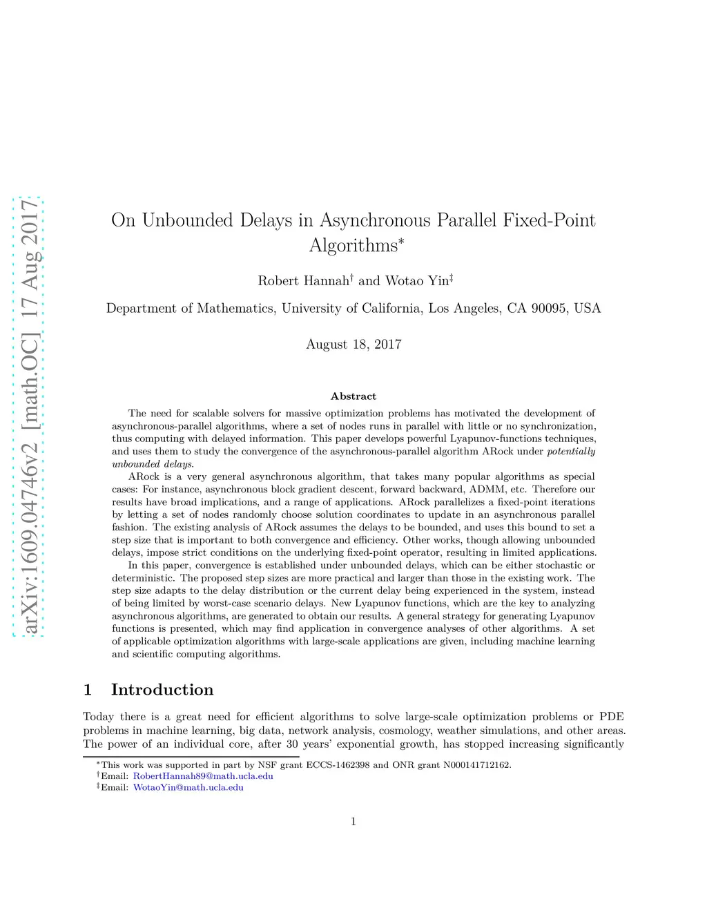 The need for scalable numerical solutions has motivated the development of asynchronous parallel algorithms, where a set of nodes run in parallel with little or no synchronization, thus computing with delayed information. This paper studies the convergence of the asynchronous parallel algorithm ARock under potentially unbounded delays. ARock is a general asynchronous algorithm that has many applications. It parallelizes fixed-point iterations by letting a set of nodes randomly choose solution coordinates and update them in an asynchronous parallel fashion. ARock takes some recent asynchronous coordinate descent algorithms as special cases and gives rise to new asynchronous operator-splitting algorithms. Existing analysis of ARock assumes the delays to be bounded, and uses this bound to set a step size that is important to both convergence and efficiency. Other work, though allowing unbounded delays, imposes strict conditions on the underlying fixed-point operator, resulting in limited applications. In this paper, convergence is established under unbounded delays, which can be either stochastic or deterministic. The proposed step sizes are more practical and generally larger than those in the existing work. The step size adapts to the delay distribution or the current delay being experienced in the system. New Lyapunov functions, which are the key to analyzing asynchronous algorithms, are generated to obtain our results. A set of applicable optimization algorithms with large-scale applications are given, including machine learning and scientific computing algorithms.
