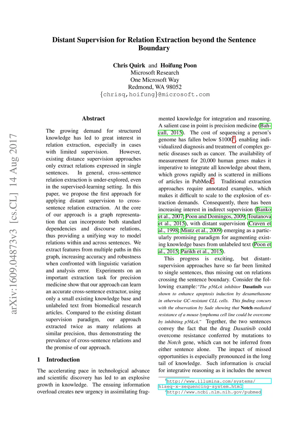 Distant Supervision for Relation Extraction beyond the Sentence Boundary