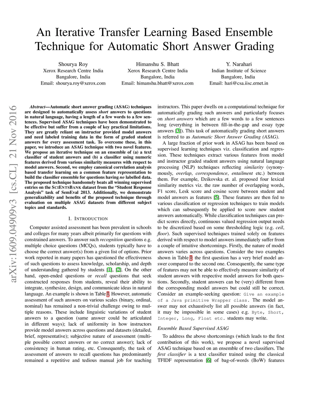 Automatic short answer grading (ASAG) techniques are designed to automatically assess short answers to questions in natural language, having a length of a few words to a few sentences. Supervised ASAG techniques have been demonstrated to be effective but suffer from a couple of key practical limitations. They are greatly reliant on instructor provided model answers and need labeled training data in the form of graded student answers for every assessment task. To overcome these, in this paper, we introduce an ASAG technique with two novel features. We propose an iterative technique on an ensemble of (a) a text classifier of student answers and (b) a classifier using numeric features derived from various similarity measures with respect to model answers. Second, we employ canonical correlation analysis based transfer learning on a common feature representation to build the classifier ensemble for questions having no labelled data. The proposed technique handsomely beats all winning supervised entries on the SCIENTSBANK dataset from the Student Response Analysis task of SemEval 2013. Additionally, we demonstrate generalizability and benefits of the proposed technique through evaluation on multiple ASAG datasets from different subject topics and standards.