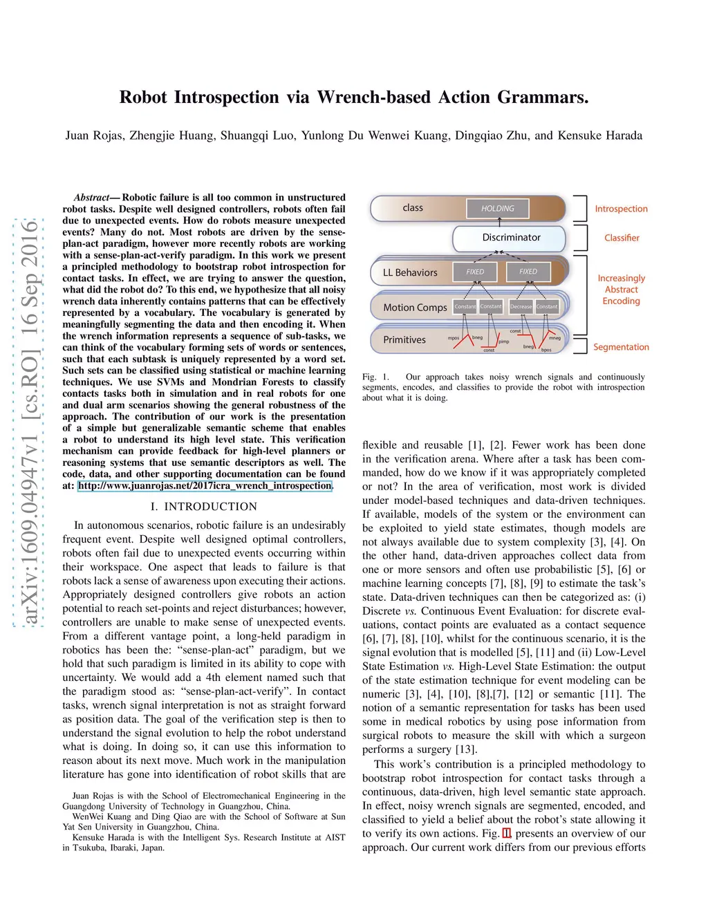 Robotic failure is all too common in unstructured robot tasks. Despite well designed controllers, robots often fail due to unexpected events. How do robots measure unexpected events? Many do not. Most robots are driven by the senseplan- act paradigm, however more recently robots are working with a sense-plan-act-verify paradigm. In this work we present a principled methodology to bootstrap robot introspection for contact tasks. In effect, we are trying to answer the question, what did the robot do? To this end, we hypothesize that all noisy wrench data inherently contains patterns that can be effectively represented by a vocabulary. The vocabulary is generated by meaningfully segmenting the data and then encoding it. When the wrench information represents a sequence of sub-tasks, we can think of the vocabulary forming sets of words or sentences, such that each subtask is uniquely represented by a word set. Such sets can be classified using statistical or machine learning techniques. We use SVMs and Mondrian Forests to classify contacts tasks both in simulation and in real robots for one and dual arm scenarios showing the general robustness of the approach. The contribution of our work is the presentation of a simple but generalizable semantic scheme that enables a robot to understand its high level state. This verification mechanism can provide feedback for high-level planners or reasoning systems that use semantic descriptors as well. The code, data, and other supporting documentation can be found at: http://www.juanrojas.net/2017icra_wrench_introspection.