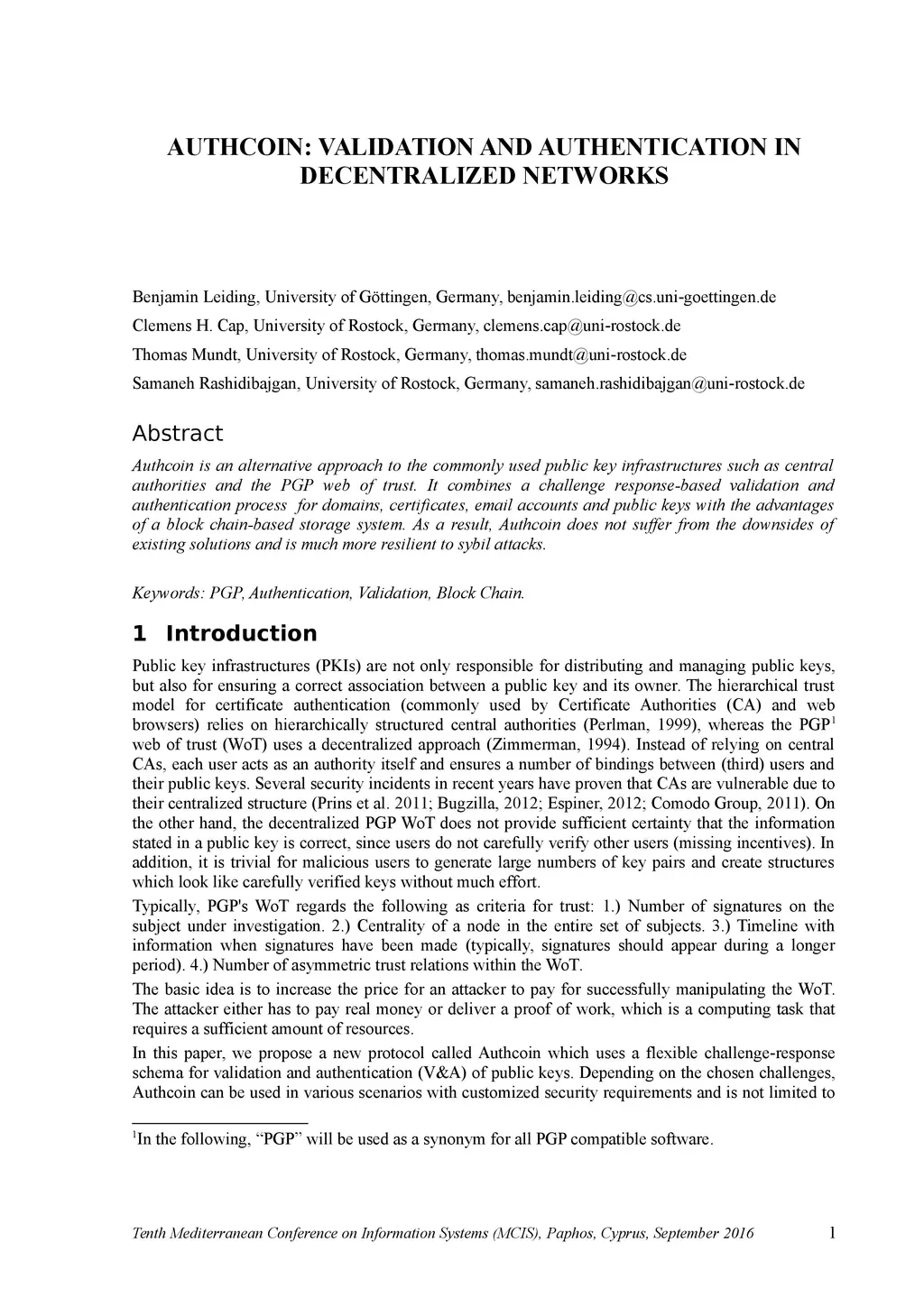 Authcoin is an alternative approach to the commonly used public key infrastructures such as central authorities and the PGP web of trust. It combines a challenge response-based validation and authentication process for domains, certificates, email accounts and public keys with the advantages of a block chain-based storage system. As a result, Authcoin does not suffer from the downsides of existing solutions and is much more resilient to sybil attacks.