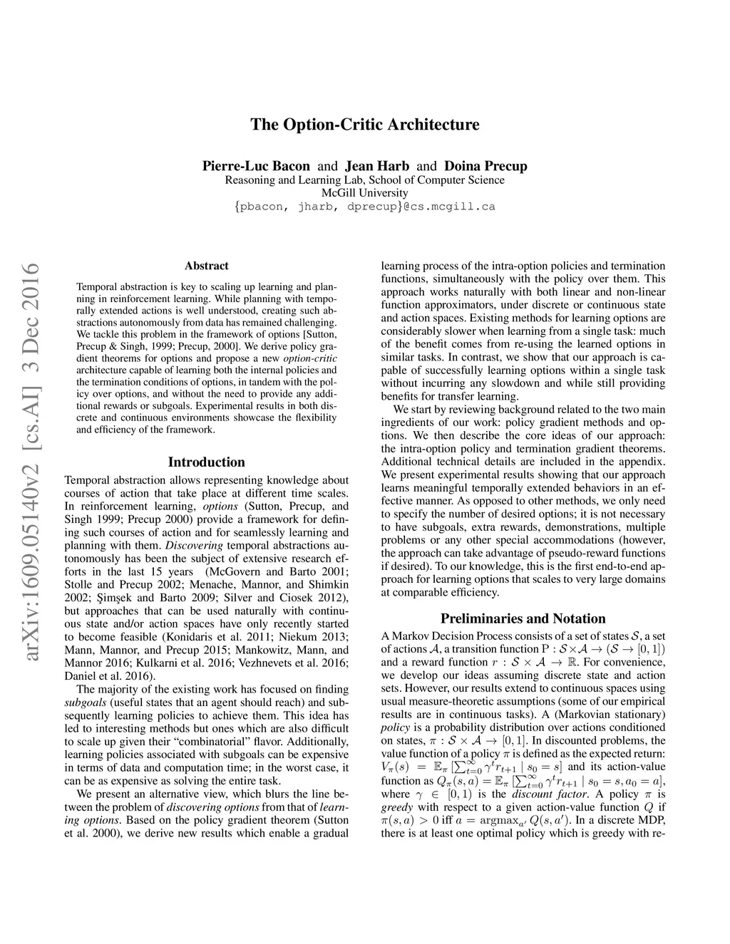 Temporal abstraction is key to scaling up learning and planning in reinforcement learning. While planning with temporally extended actions is well understood, creating such abstractions autonomously from data has remained challenging. We tackle this problem in the framework of options [Sutton, Precup & Singh, 1999; Precup, 2000]. We derive policy gradient theorems for options and propose a new option-critic architecture capable of learning both the internal policies and the termination conditions of options, in tandem with the policy over options, and without the need to provide any additional rewards or subgoals. Experimental results in both discrete and continuous environments showcase the flexibility and efficiency of the framework.